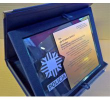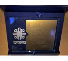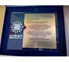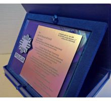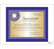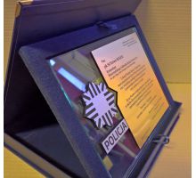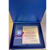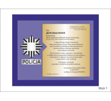 Dedykacja, grafiki, zdjęcia oraz logotypy nadrukowane są.na złotej blaszce lub grawerowane w laminacie i umieszczone są za szkłem w złoconej ramce.