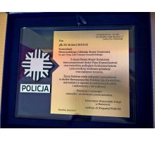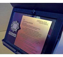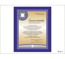 Dyplom okolicznościowy w szklanej ramie z drewnianym złoconym rantem z laminatem z grawerem lub blaszką z nadrukiem.