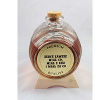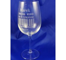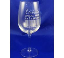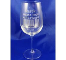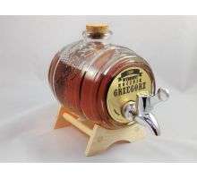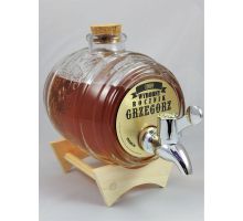 Prezent urodzinowy w postaci grawerowanej szklanej beczki z kranikiem.