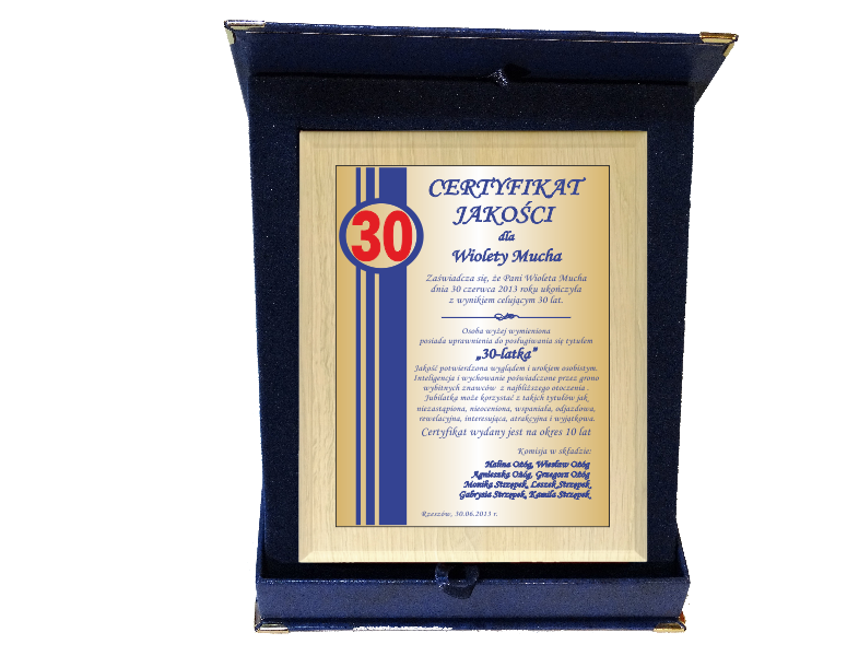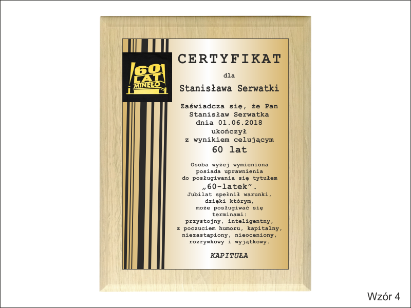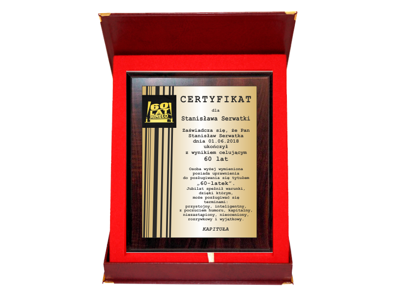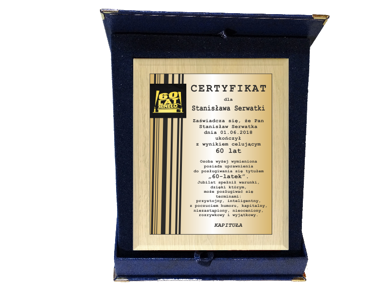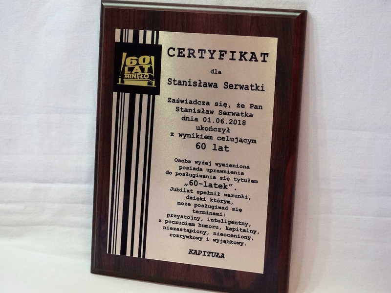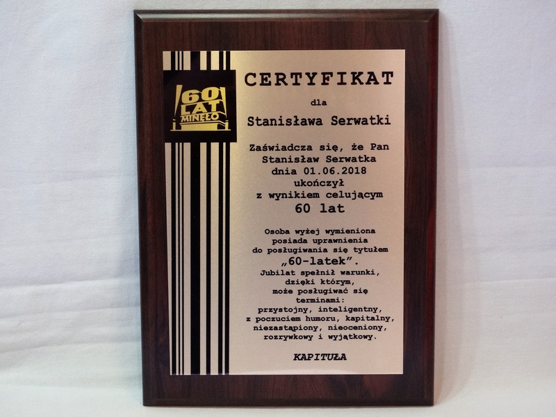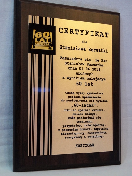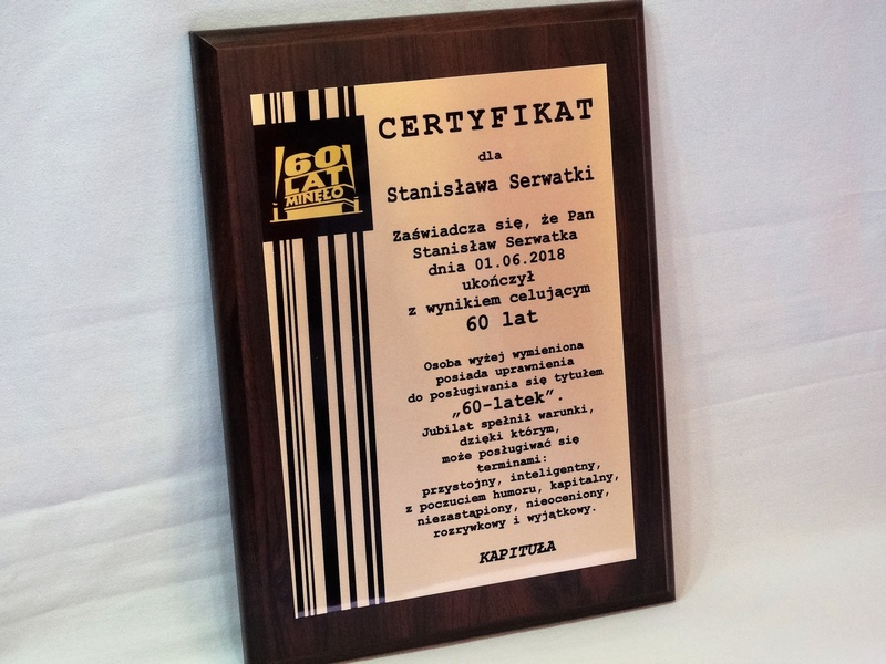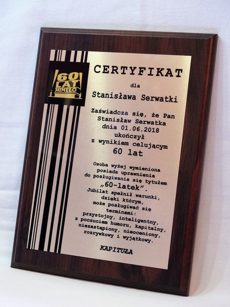 Drewniany dyplom jako okolicznościowy certyfikat urodzinowy na standardowym drewnianym podkładzie.
