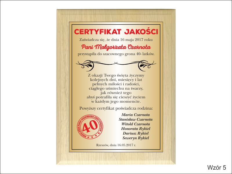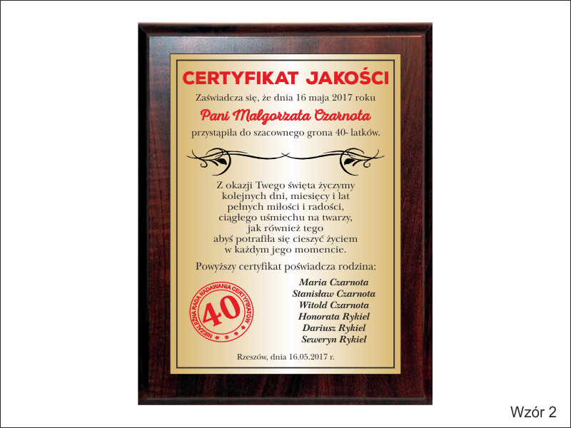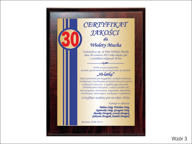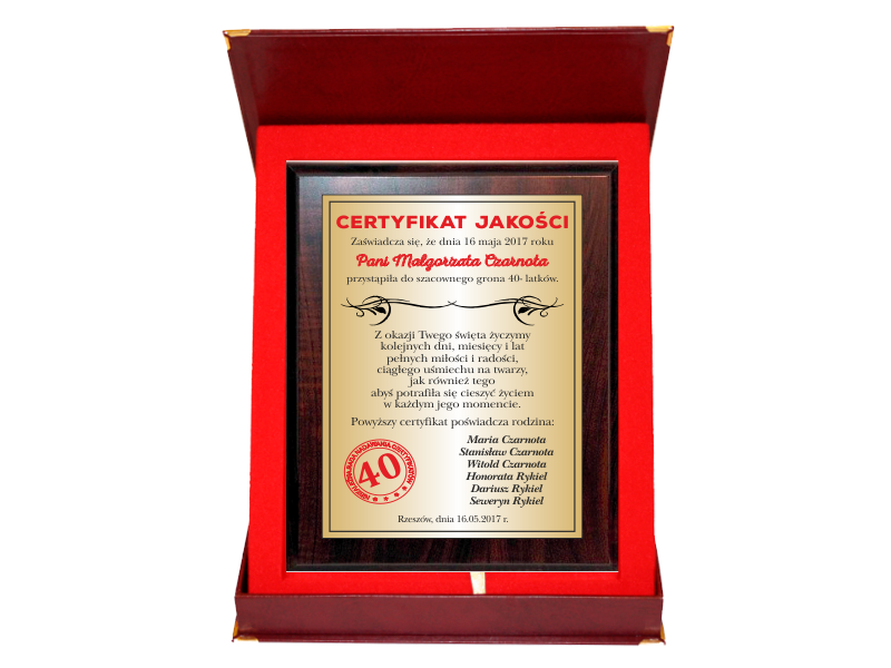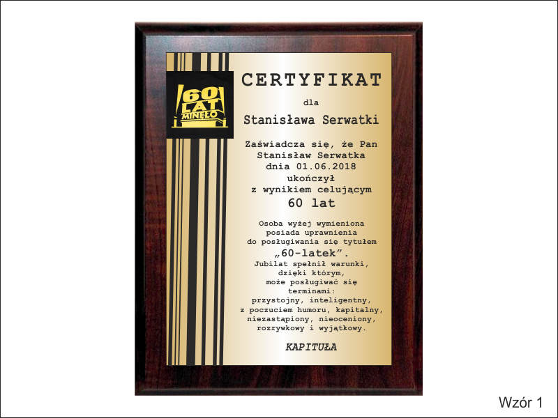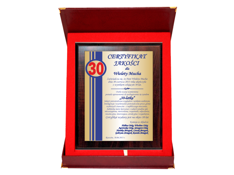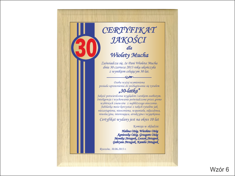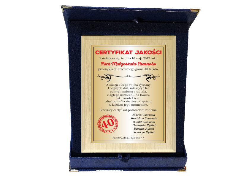 Drewniany dyplom jako okolicznościowy certyfikat urodzinowy na standardowym drewnianym podkładzie.