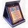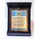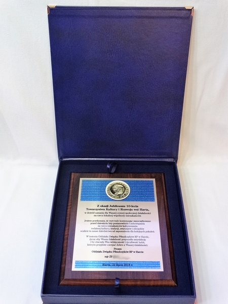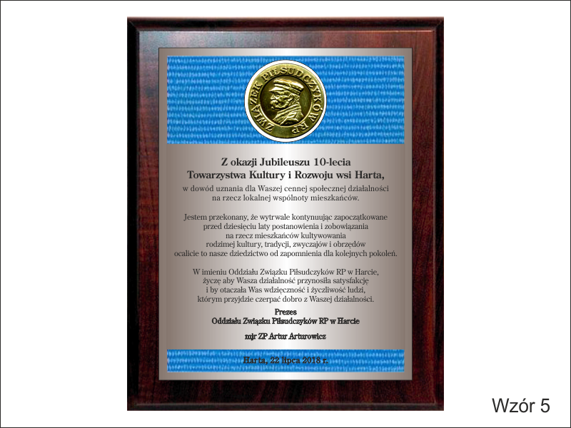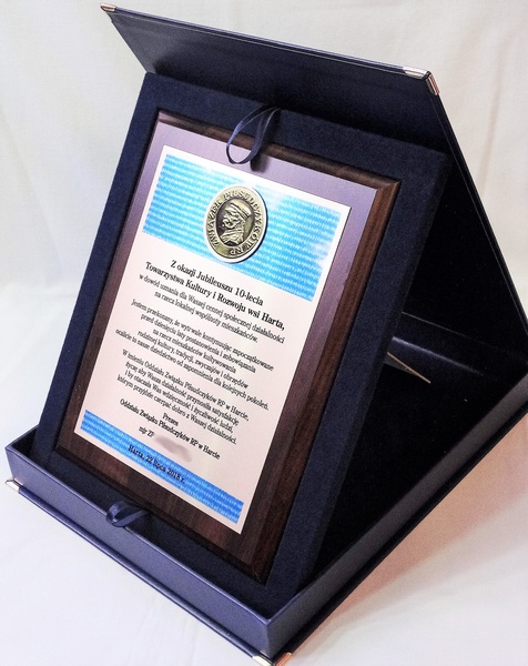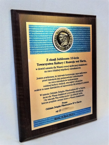 Drewniany dyplom pamiątkowy z okazji jubileuszu działalności stowarzyszenia na drewnianym podkładzie z blachą z nadrukiem.