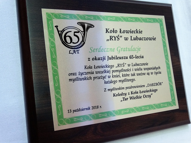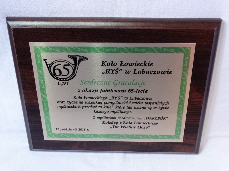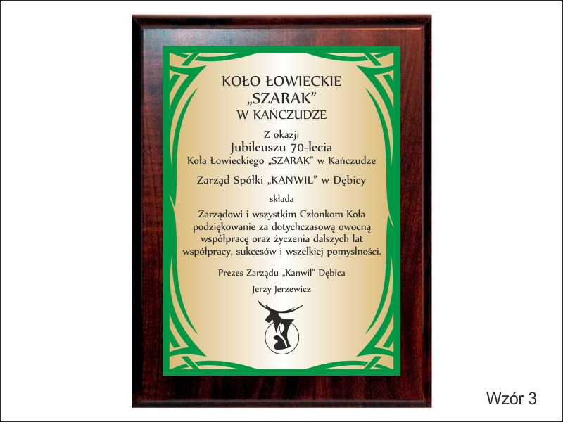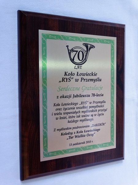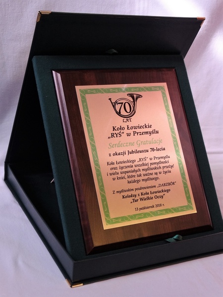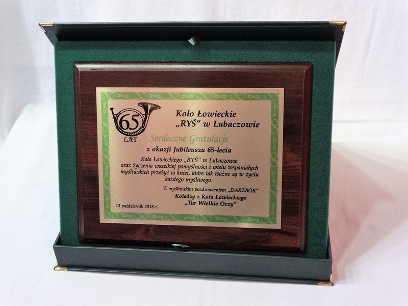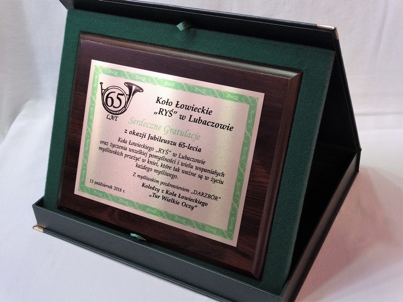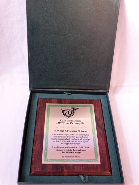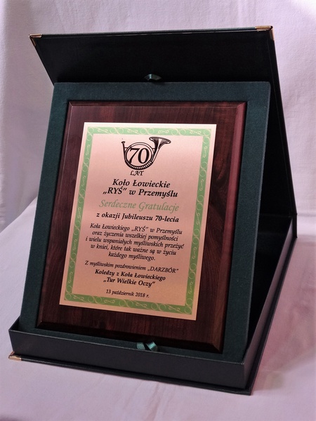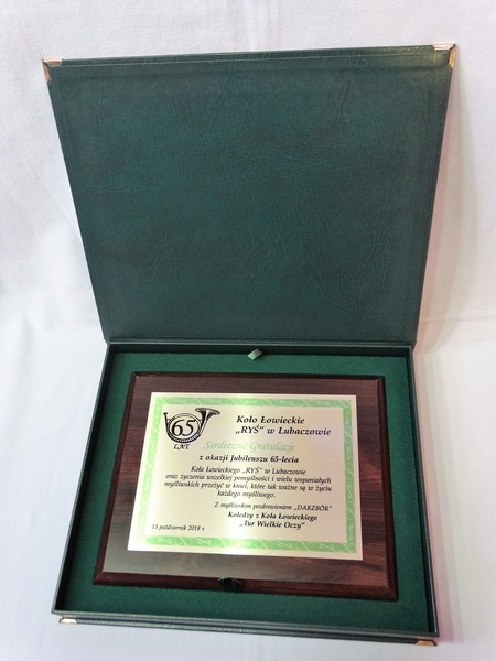 Prezentowany dyplom dedykowany jest jako pamiątka z okazji Jubileuszu Koła Łowieckiego, ale można wykonać go też na inną okoliczność.