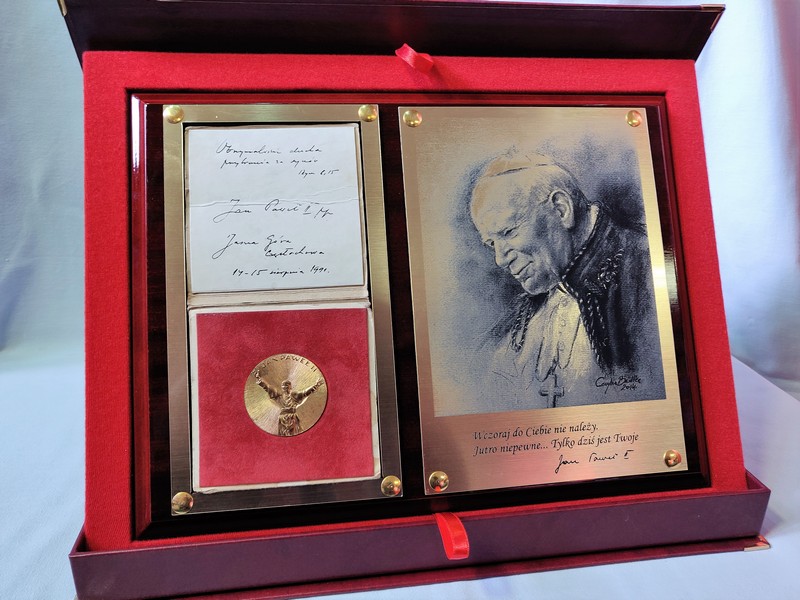 W prezentowanym przykładzie medal został dostarczony w oryginalnym kartonowym pudełku z odręczną dedykacją Jana Pawła II.