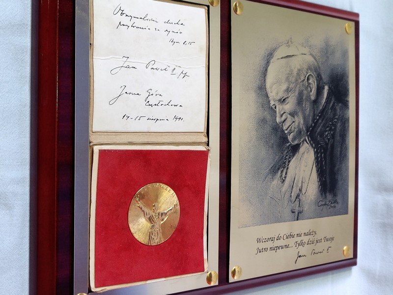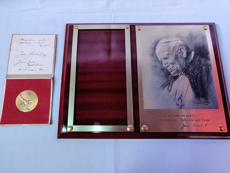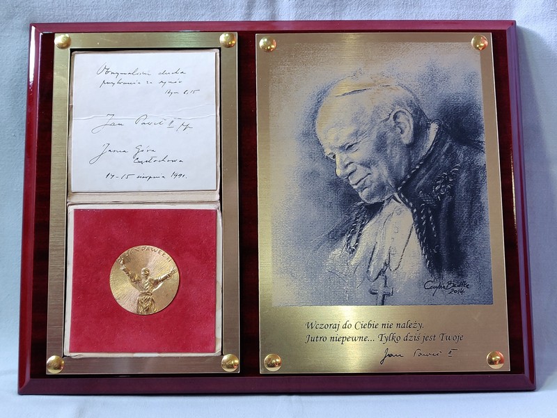 Dodatkowo w celu podkreślenia okazji z jakiej medal został wykonany oraz osoby, z którą medal jest związany obok medalu na złotym laminacie wykonano grawer zdjęcia Jana Pawła II i cytatu naszego wielkiego rodaka.