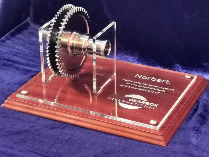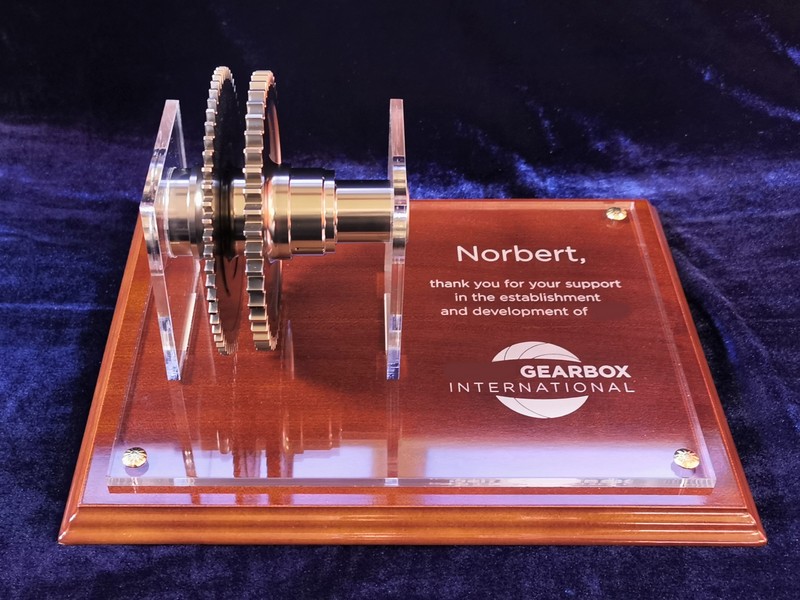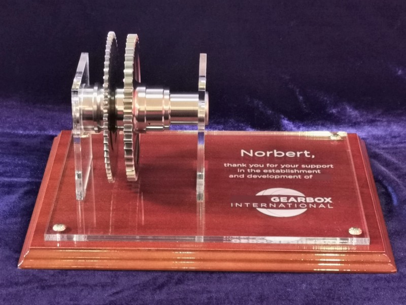 Tuleja z zębatkami zamontowana jest na pionowych uchwytach z pleksy osadzonych następnie w pleksie z grawerowaną dedykacją, która jest przytwierdzona do podkładu drewnianego.