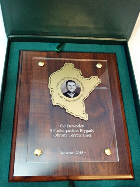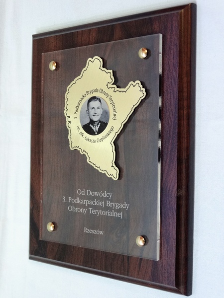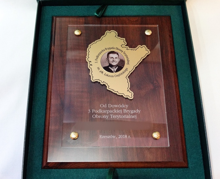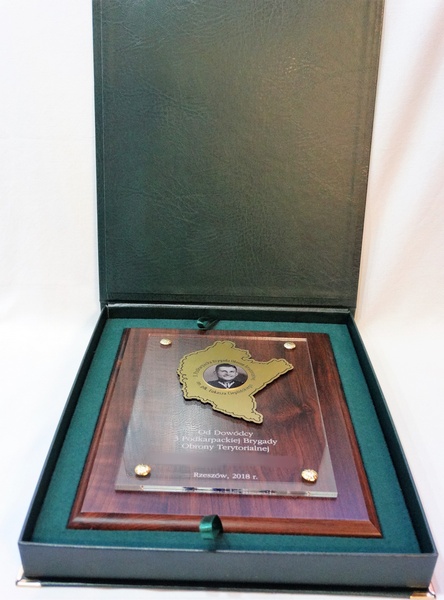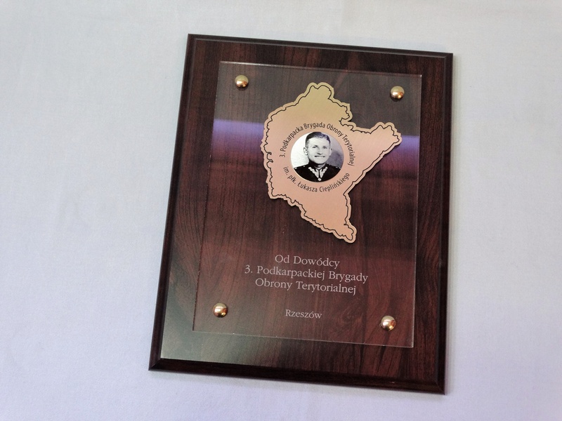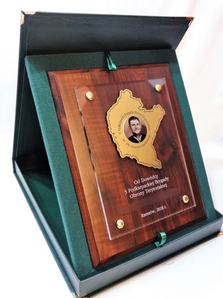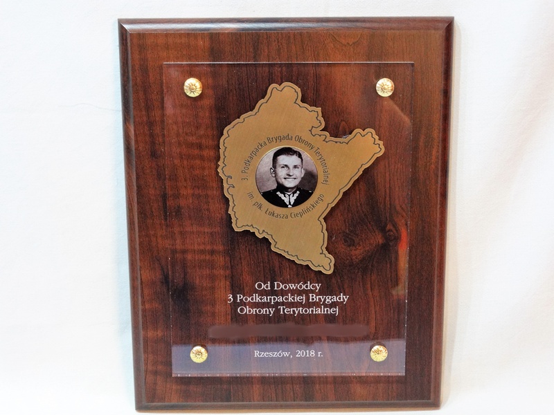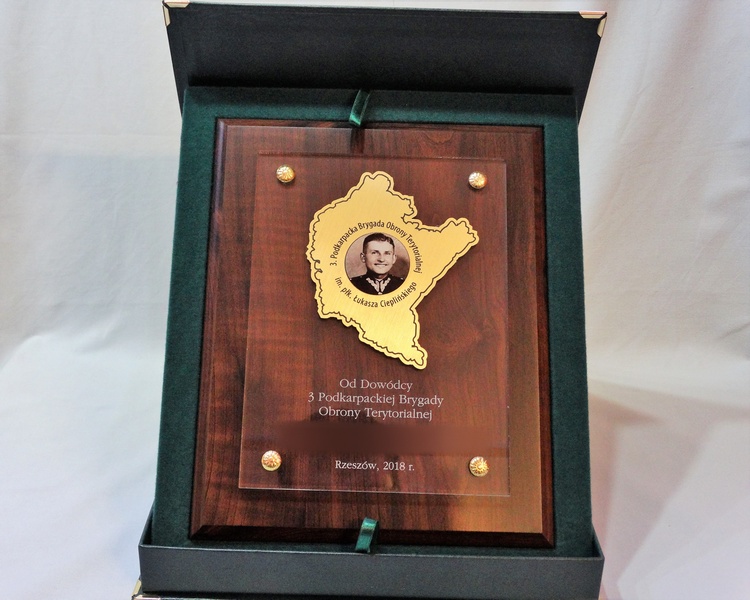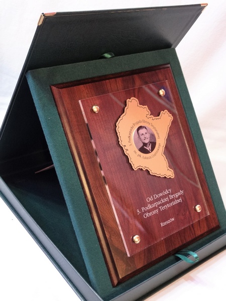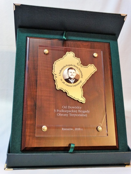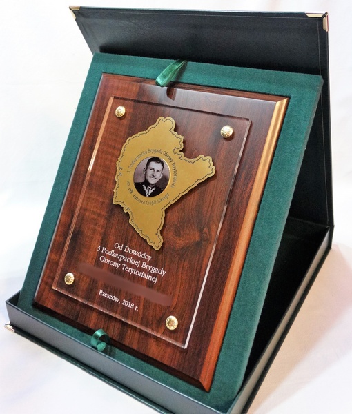 - z bezbarwnej pleksi z grawerem dedykacji oraz