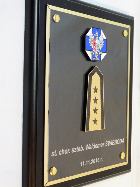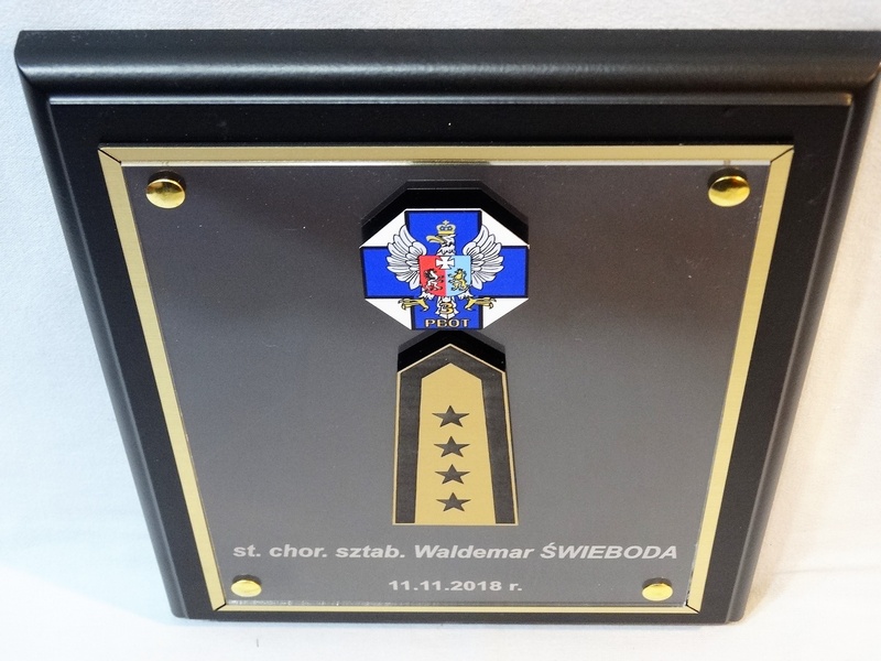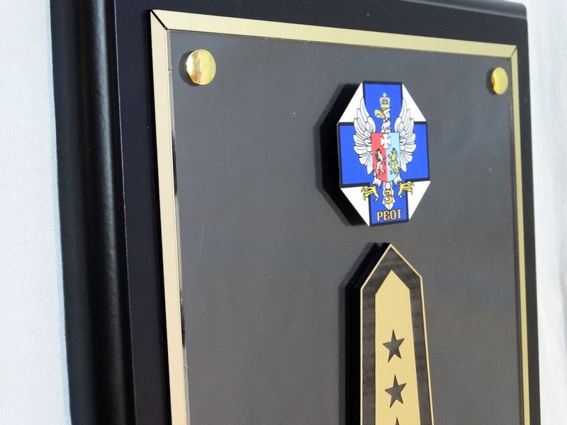 - z herbu / logotypu / odznaki / pagonu wyciętego i grawerowanego z laminatu lub nadrukowanego z blaszki
