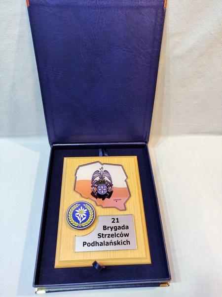 Pamiątkowy dyplom w formie Ryngrafu na drewnianym standardowym podkładzie, składający się: