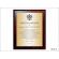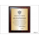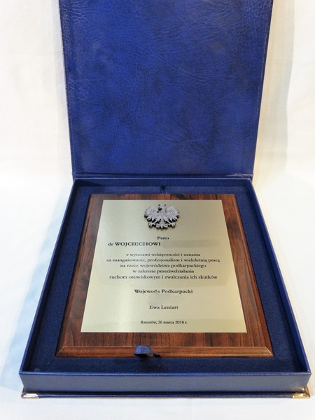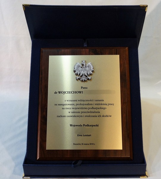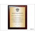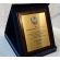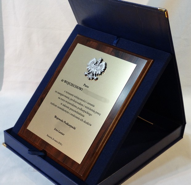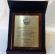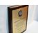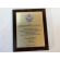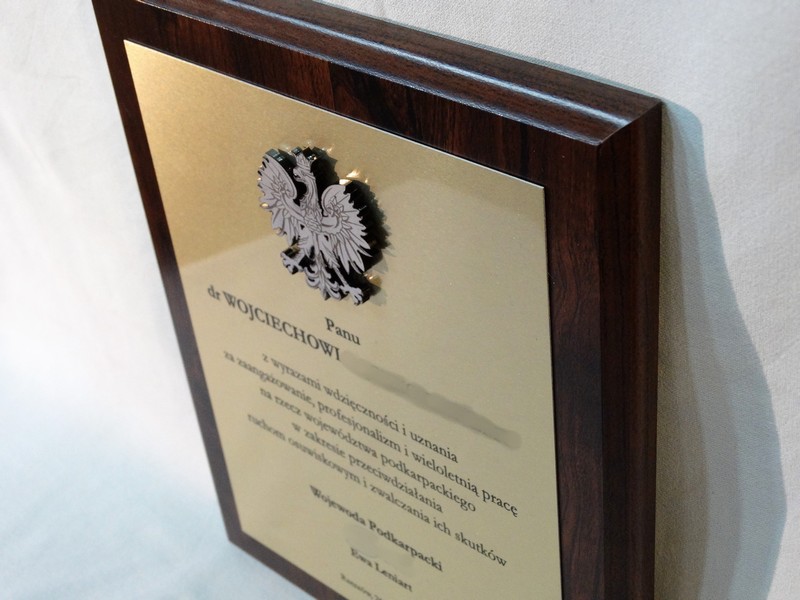 Dyplom okolicznościowy na drewnianym standardowym podkładzie z blachą z nadrukiem oraz z dodatkowym grawerowanym emblematem.