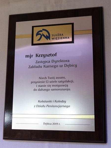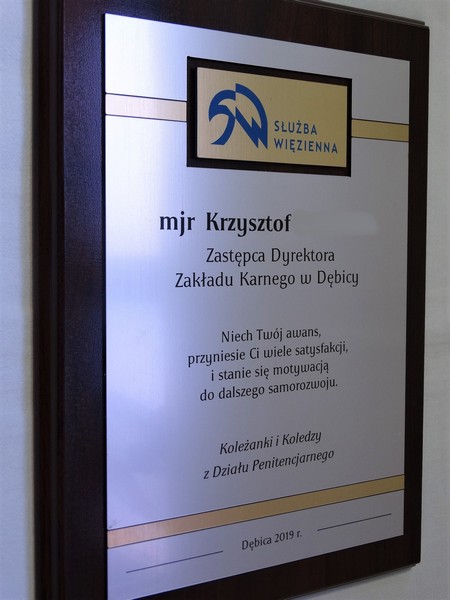 Dyplom drewniany grawerowany złożony, wykonany na standardowym podkładzie z okazji awansu.