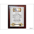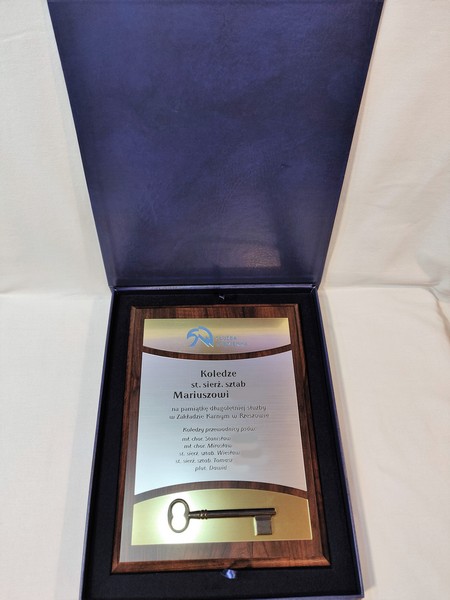 Pamiątkowy dyplom okolicznościowy z wpasowanym żeliwnym kluczem, na standardowym drewnianym podkładzie.