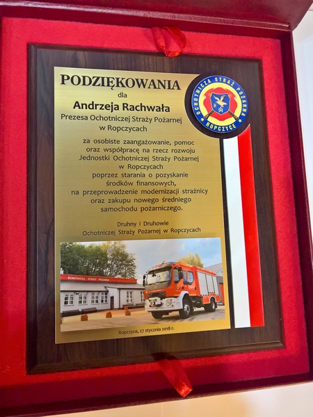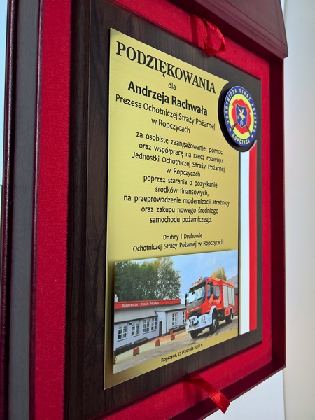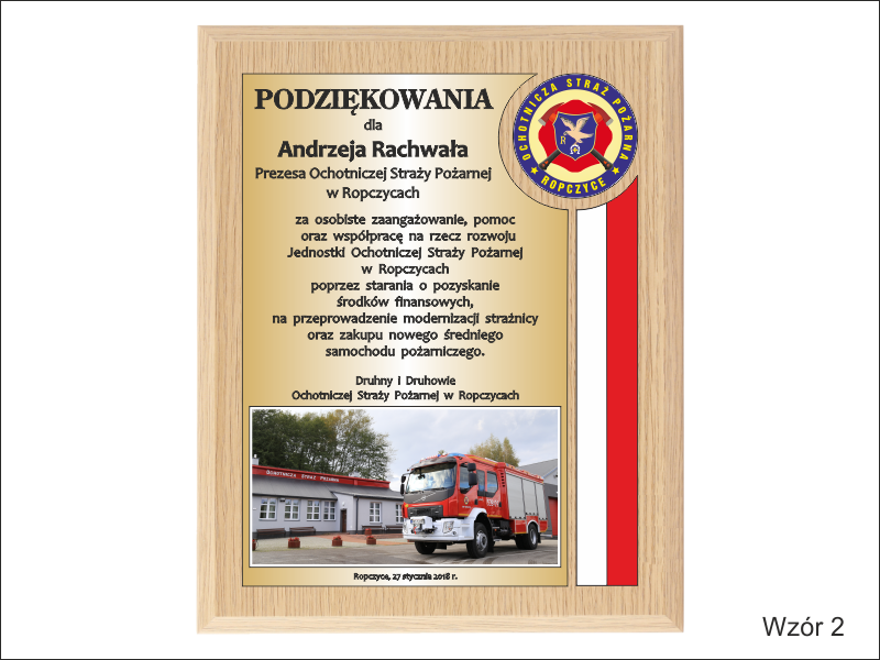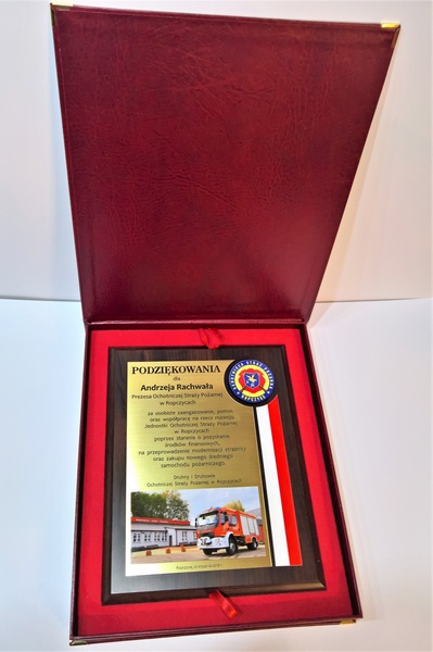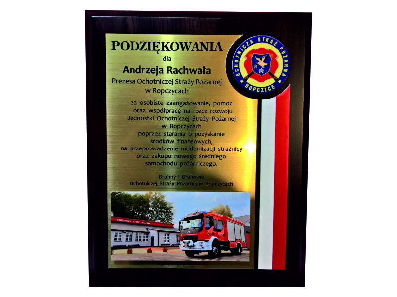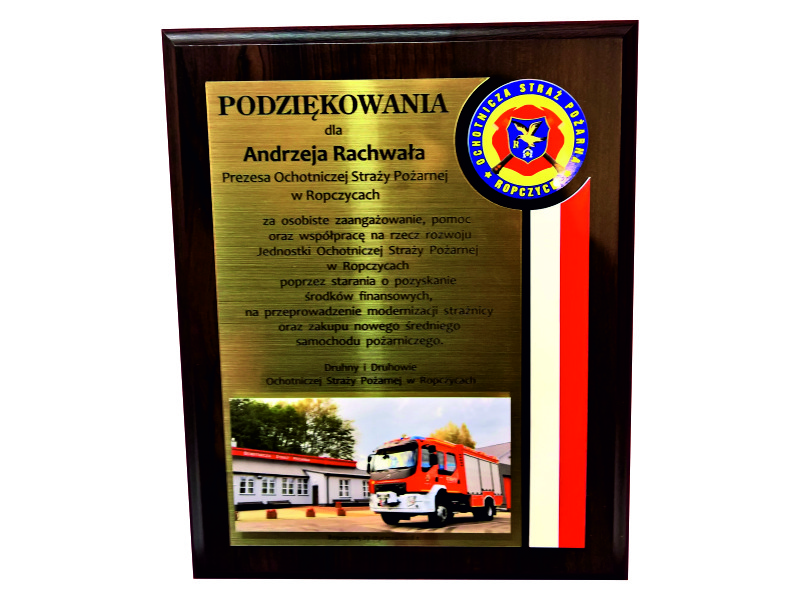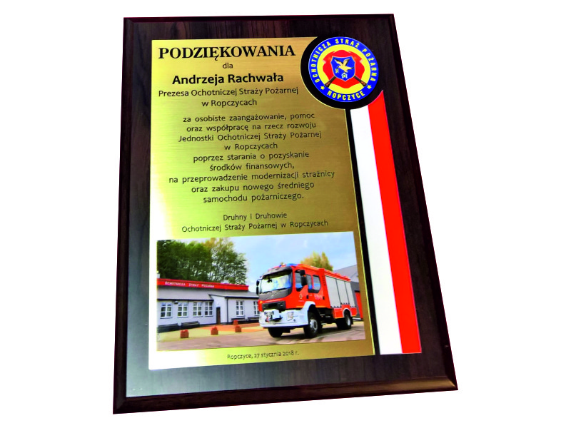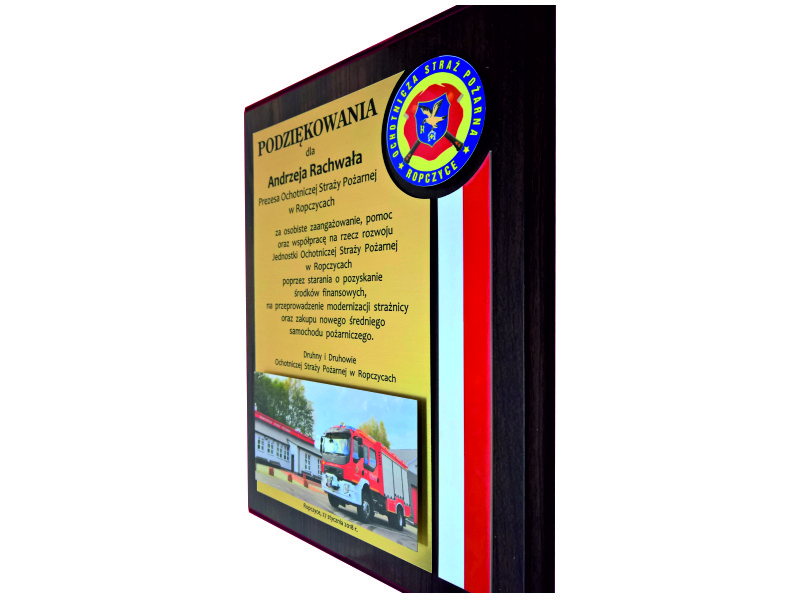 Dyplom okolicznościowy na drewnianym standardowym podkładzie jako wyraz podziękowania od strażaków.