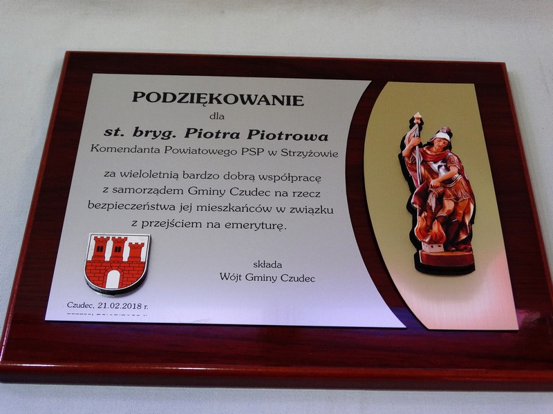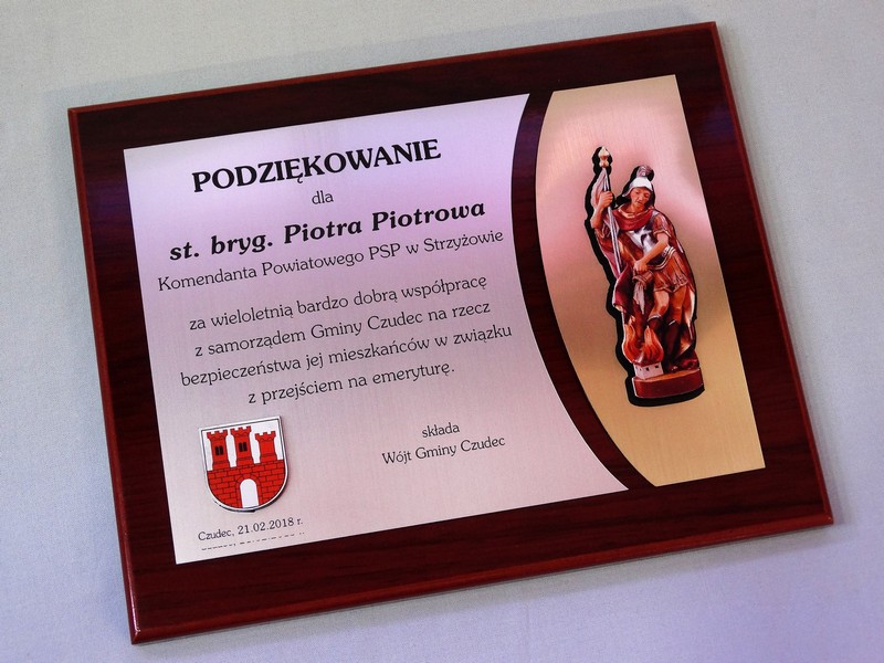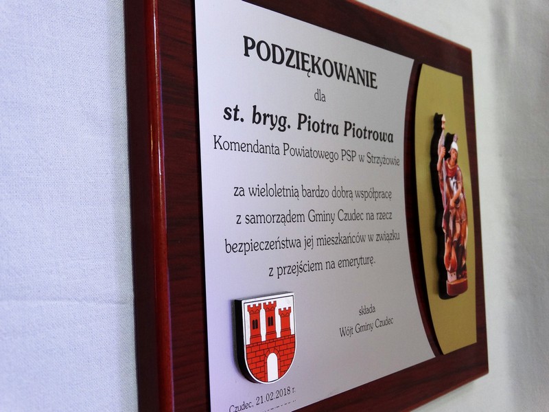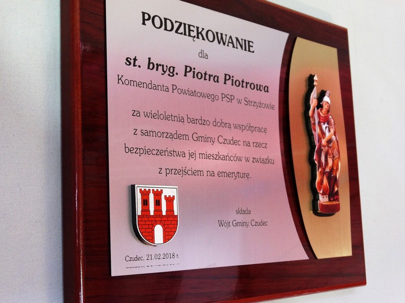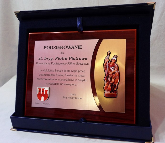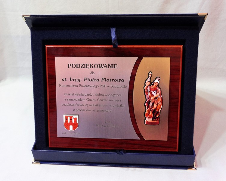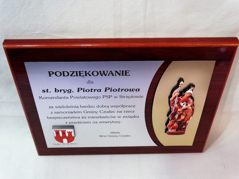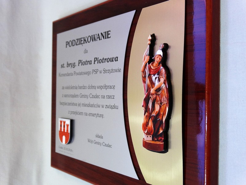 Dyplom okolicznościowy na lakierowanym drewnianym podkładzie jako podziękowanie dla Straży lub Strażaka.