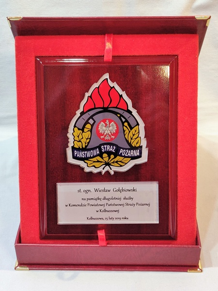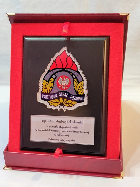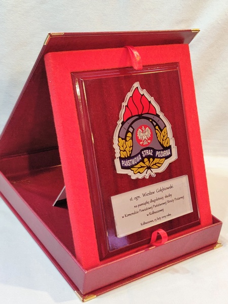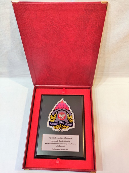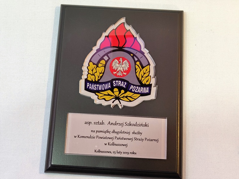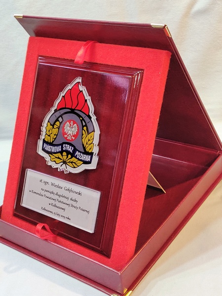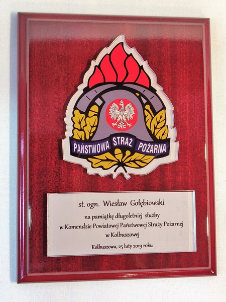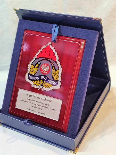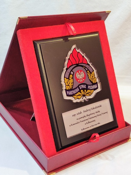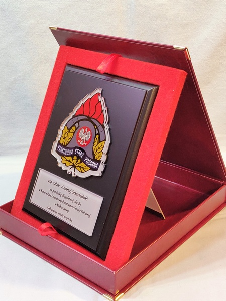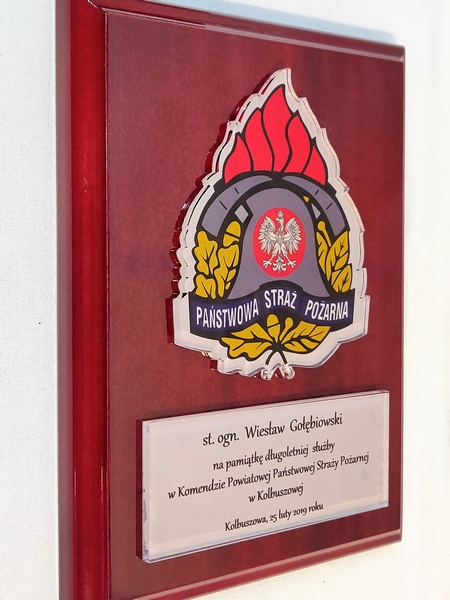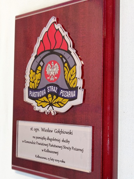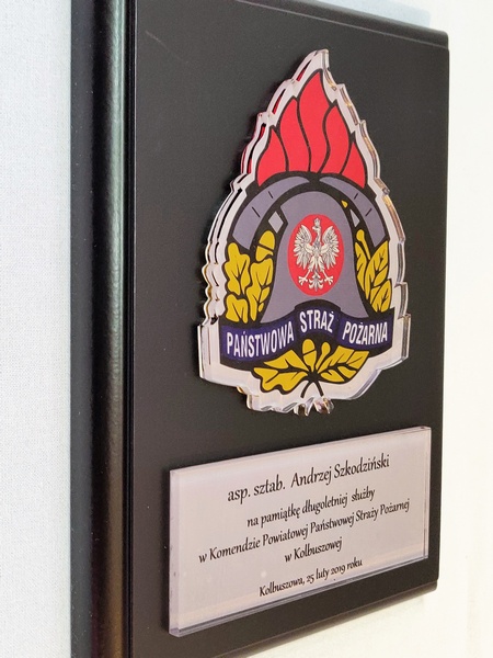 - z umieszczonej pod odznaką bezbarwnej pleksi z nadrukiem dedykacji,