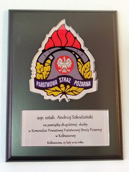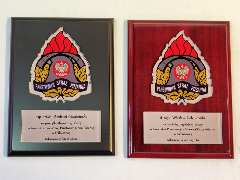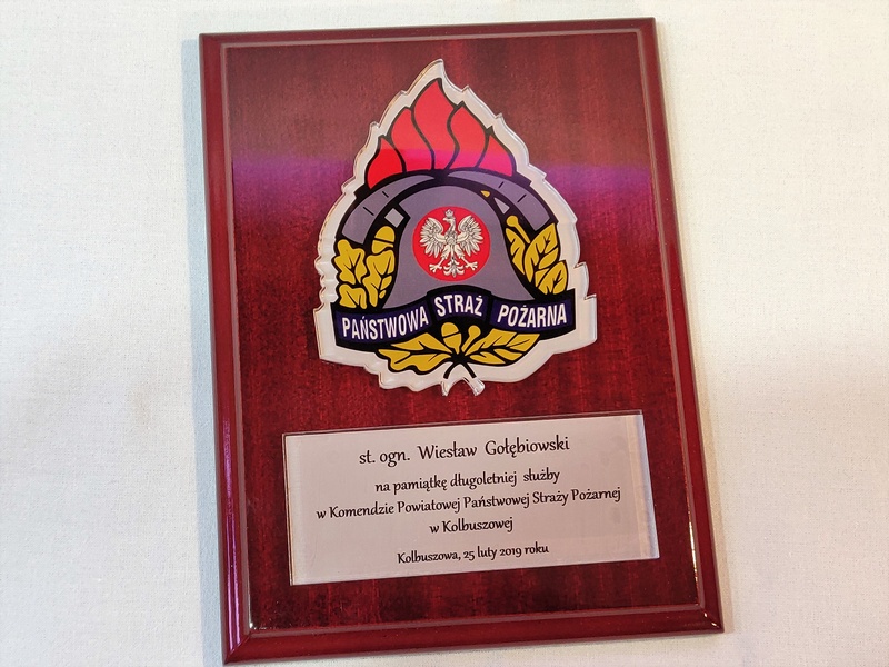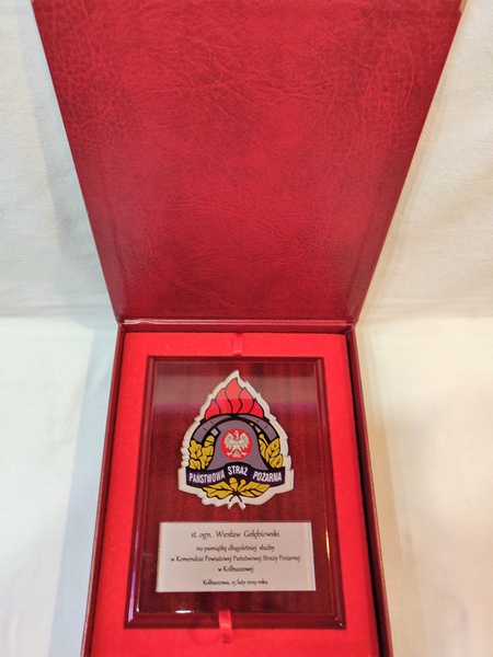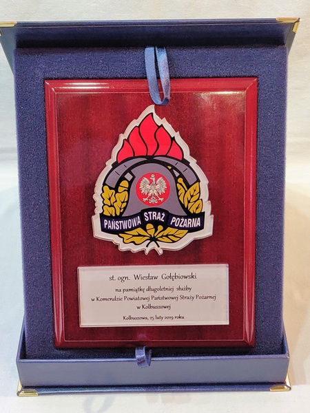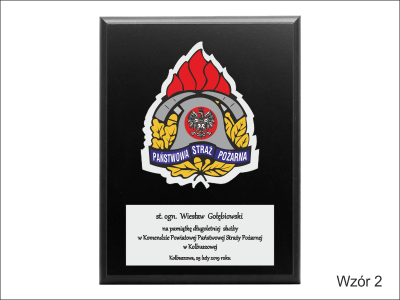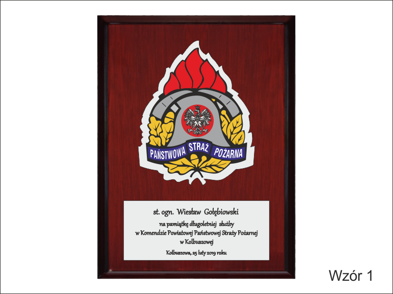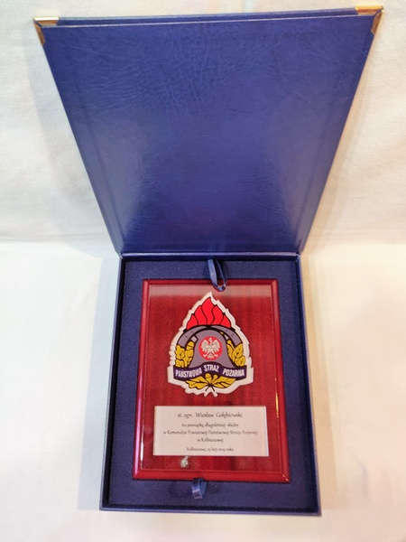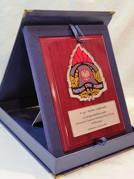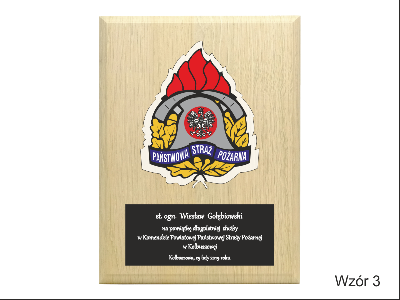 - z umieszczonej pod odznaką bezbarwnej pleksi z nadrukiem dedykacji,