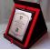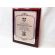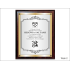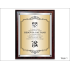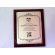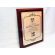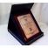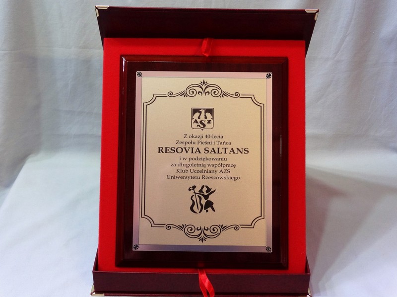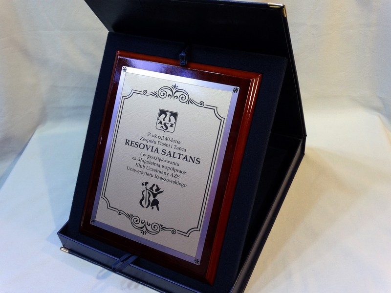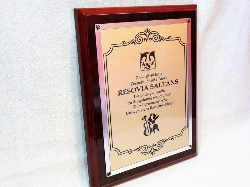 Złożony dyplom okolicznościowy na lakierowanym bordowym drewnianym podkładzie, składający się: