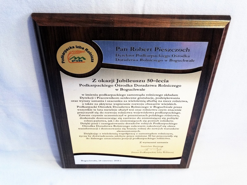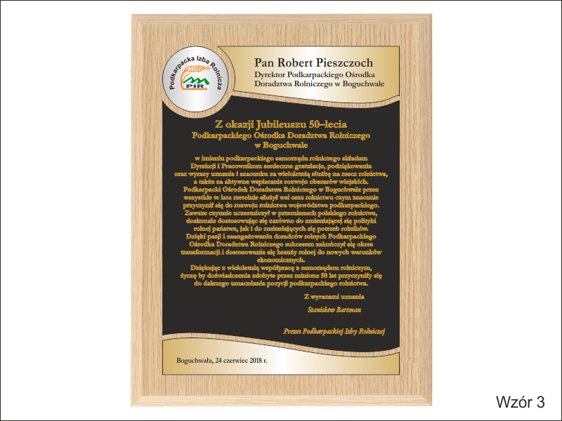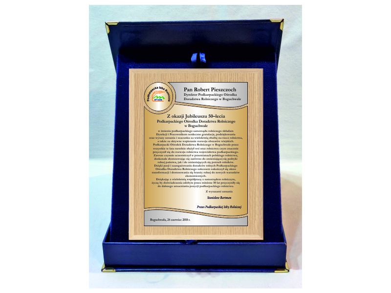 Dyplom drewniany złożony wykonany z laminatów na standardowym podkładzie na pamiątkę jubileuszu działalności, składający się:
