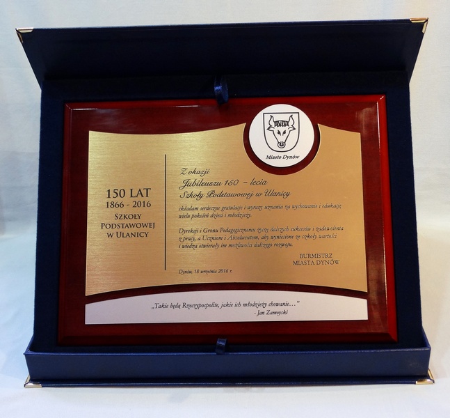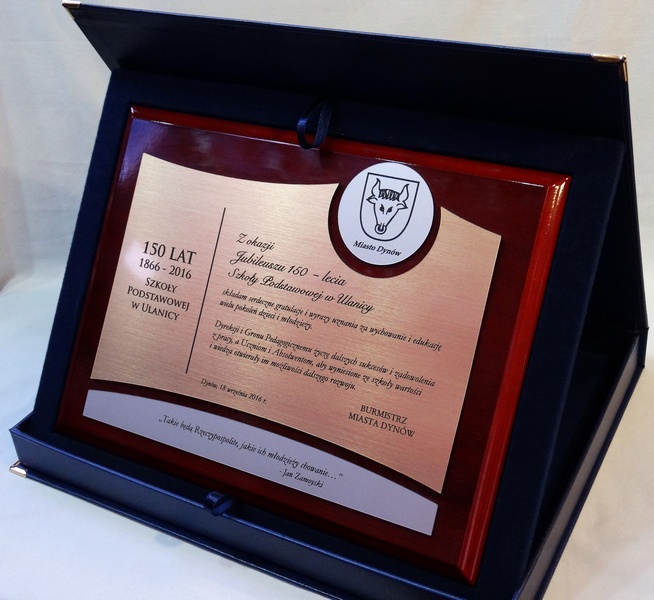 - z dopasowanych do siebie grawerowanych laminatów z dedykacją, herbem, logiem, odznaką