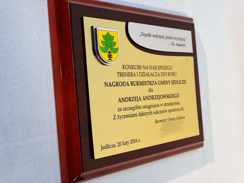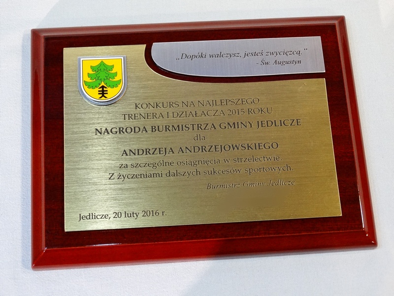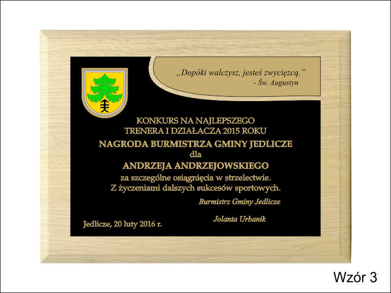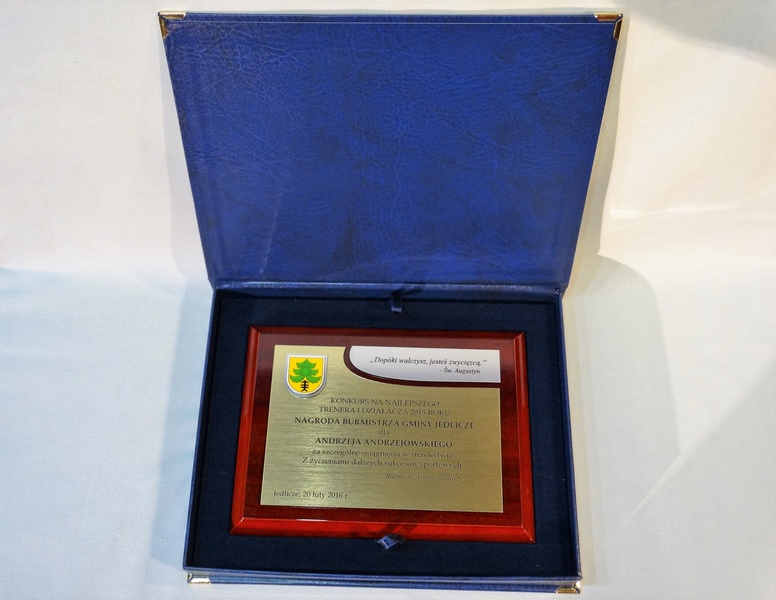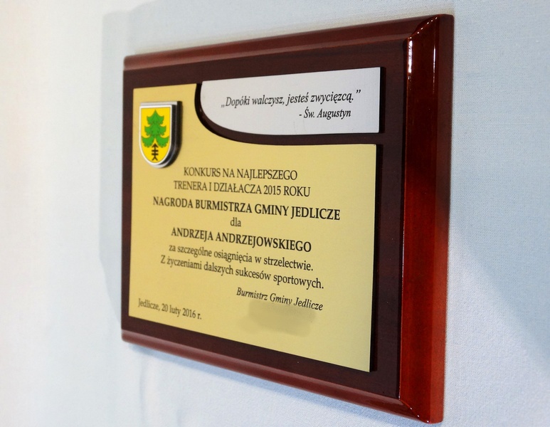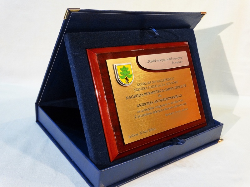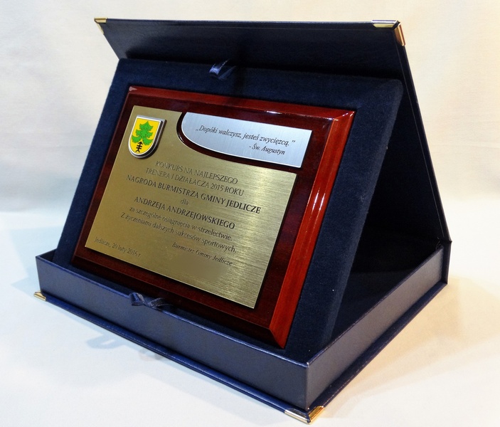 - z dopasowanych do siebie laminatów z wygrawerowaną dedykacją i wkomponowanym miejscem na herb, logo, odznakę