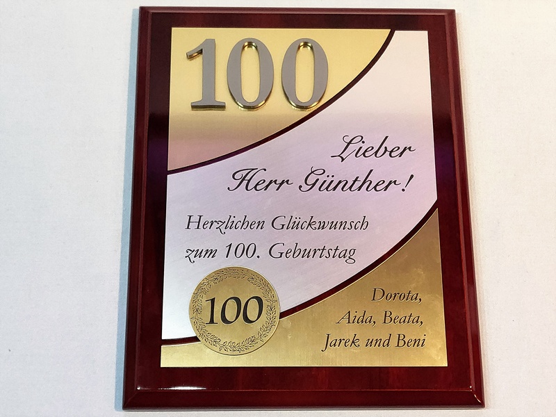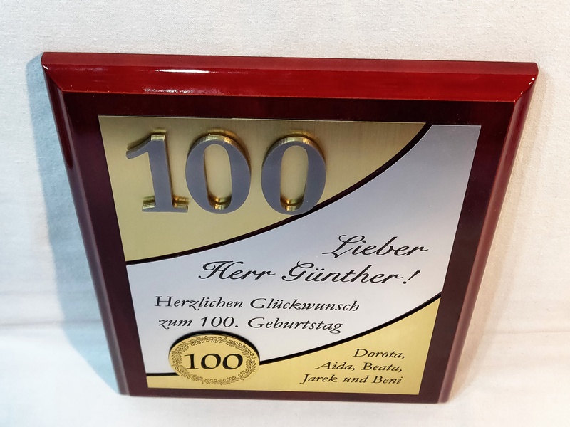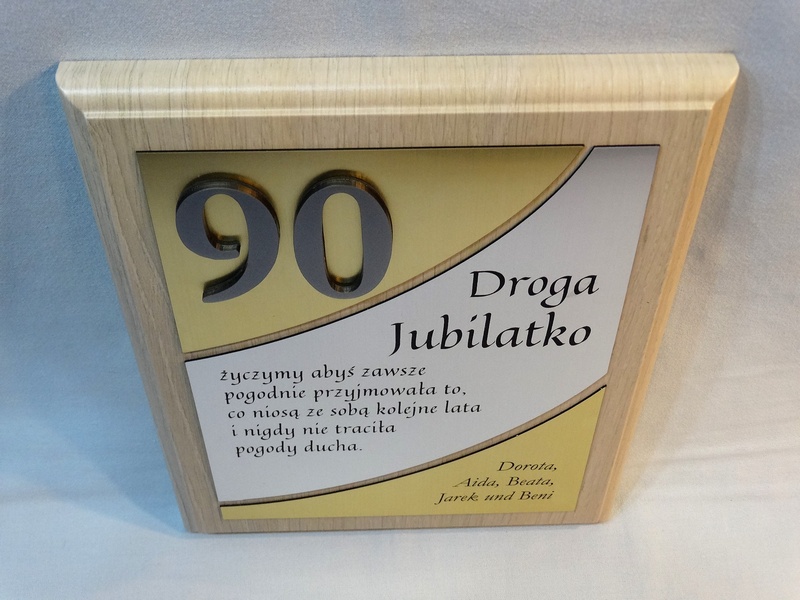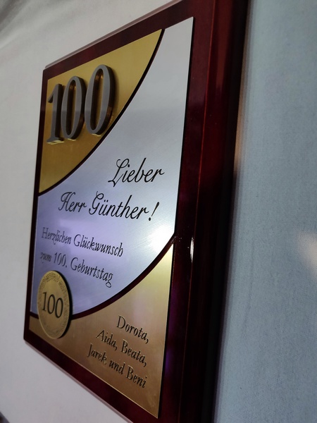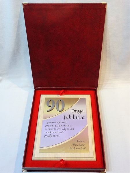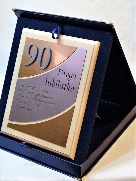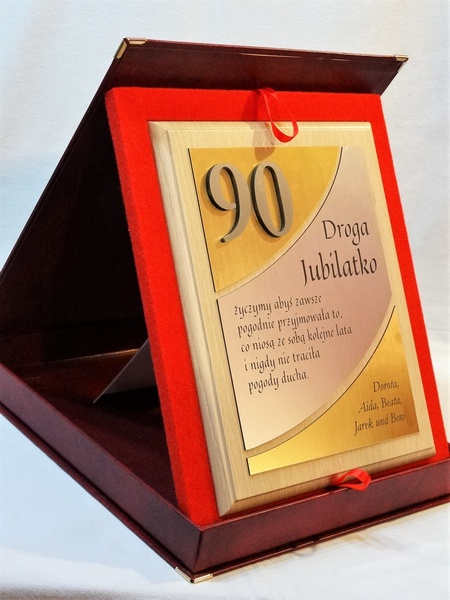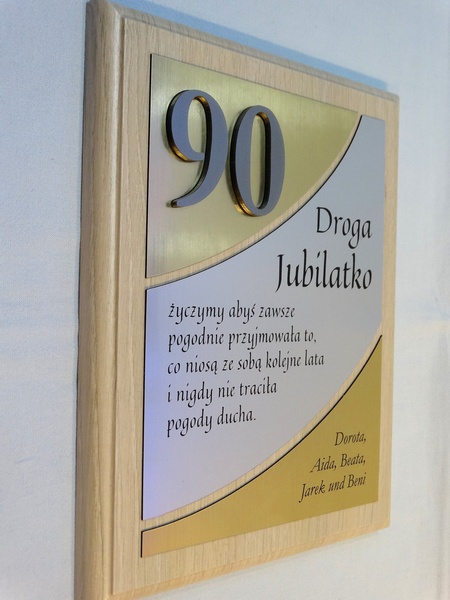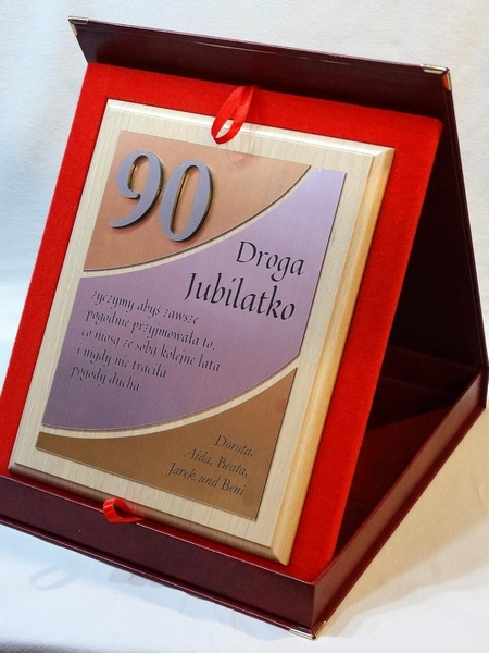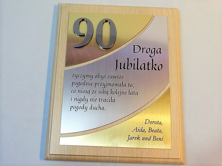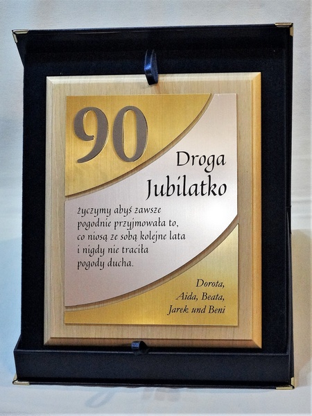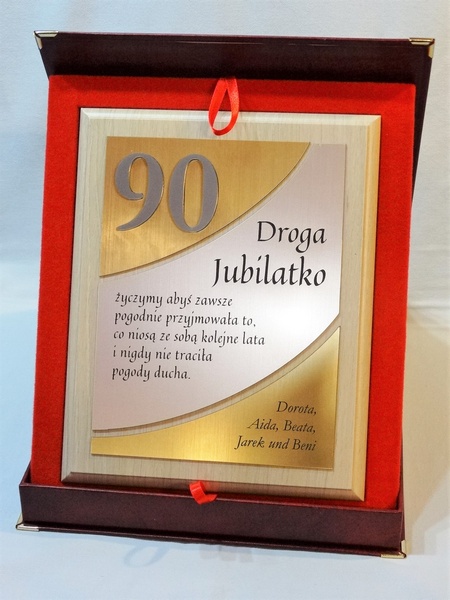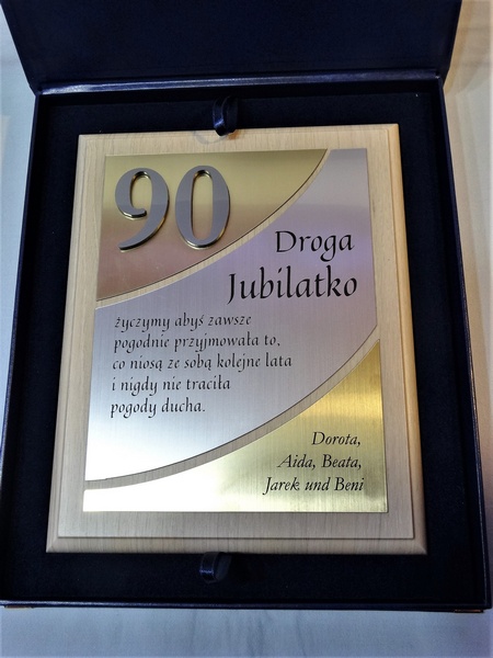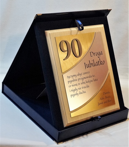 - z dopasowanych do siebie złotego i srebrnego laminatów z grawerowaną dedykacją oraz