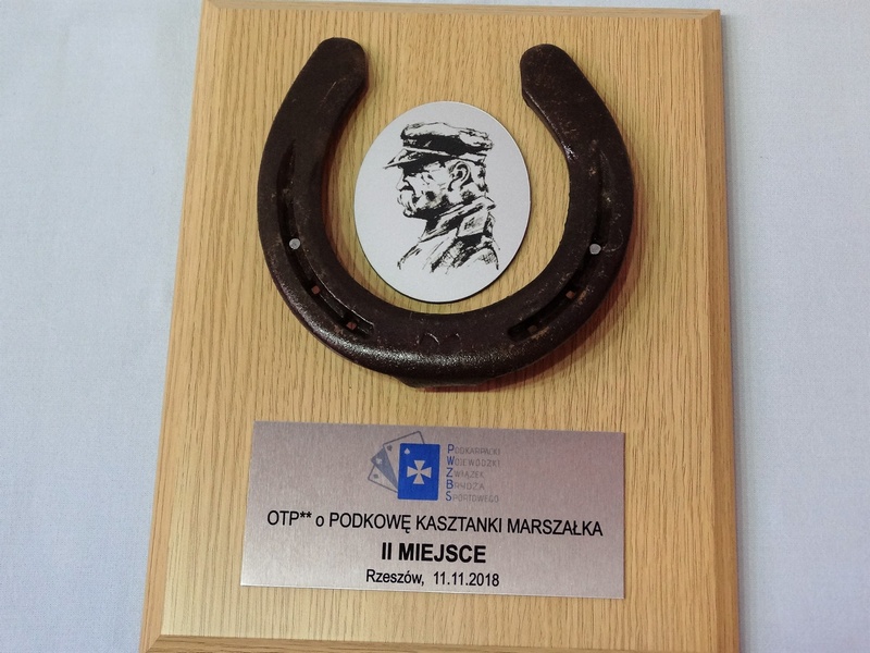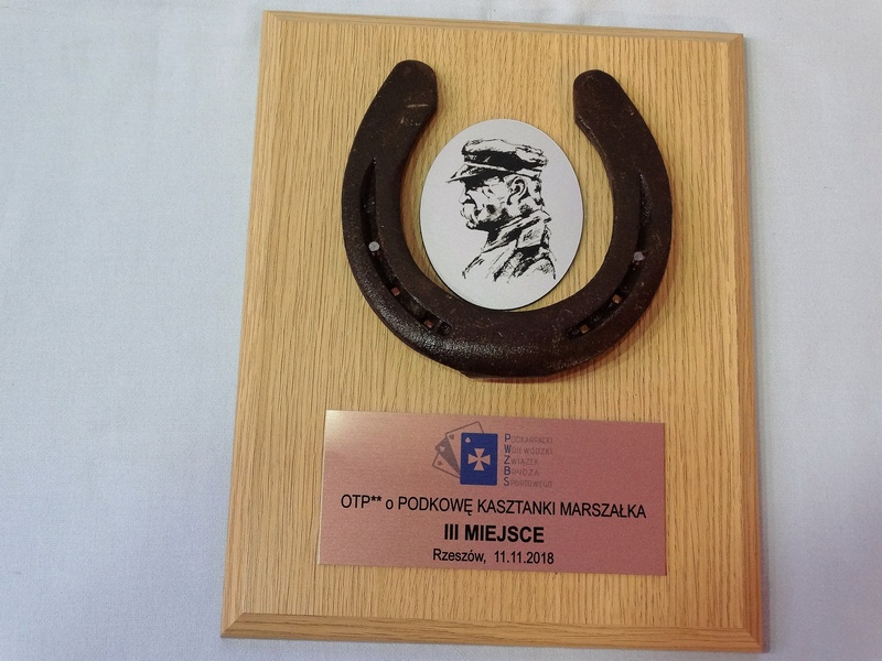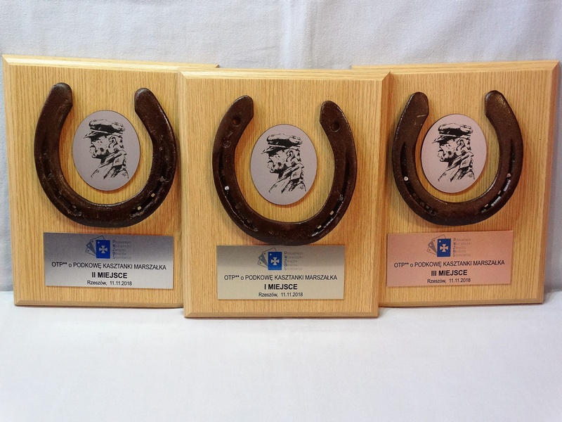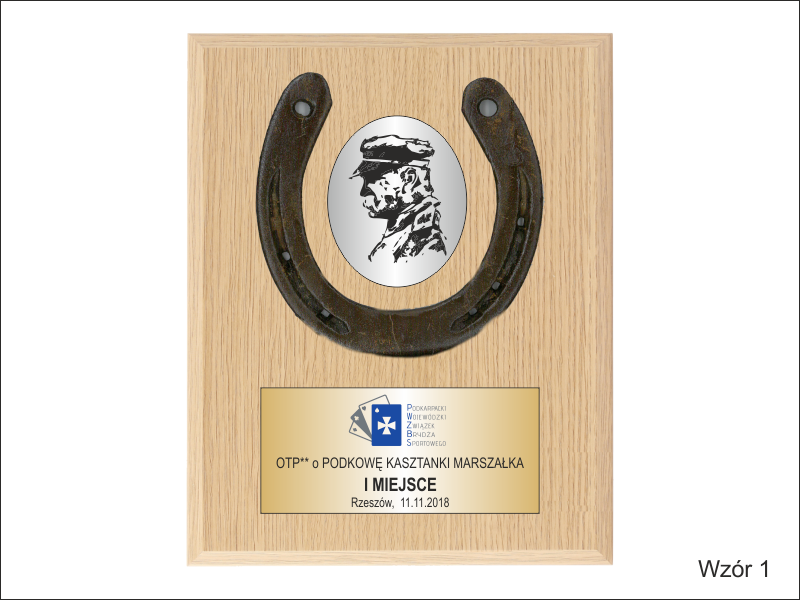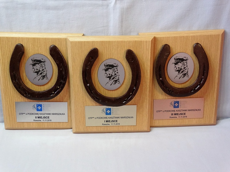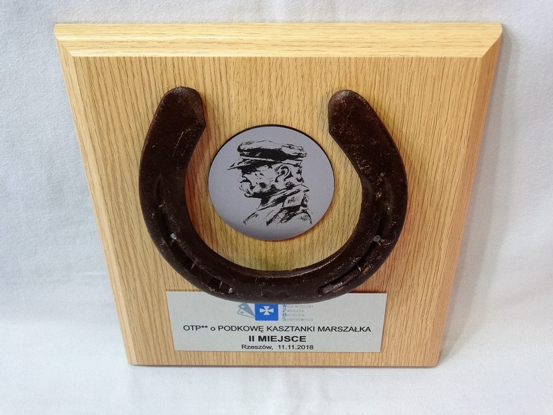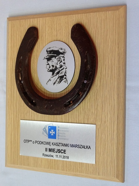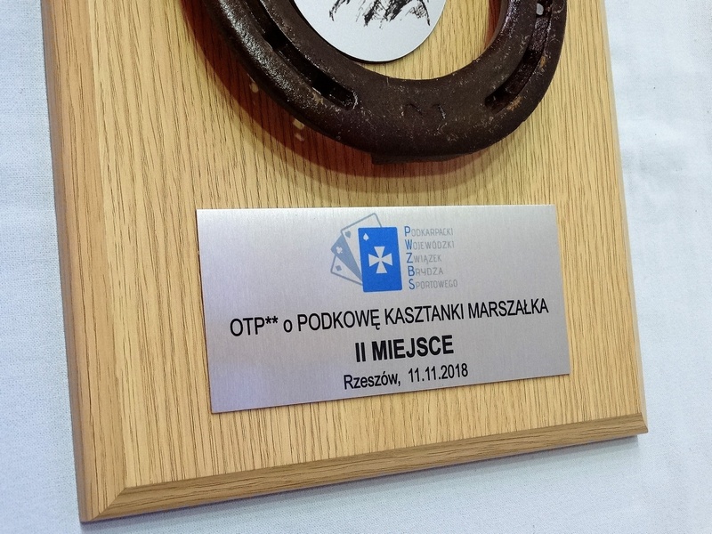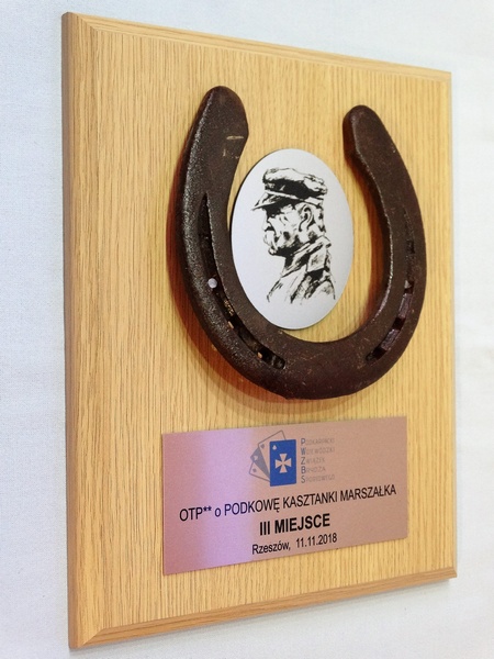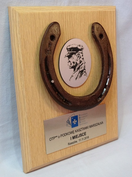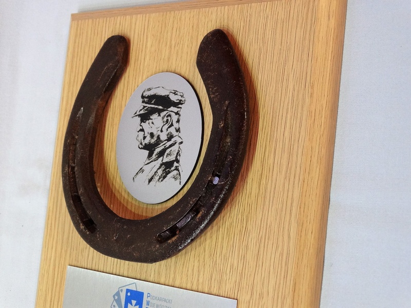 Złożony dyplom okolicznościowy na drewnianym podkładzie z podkową, jako nagroda w konkursie składający się:
