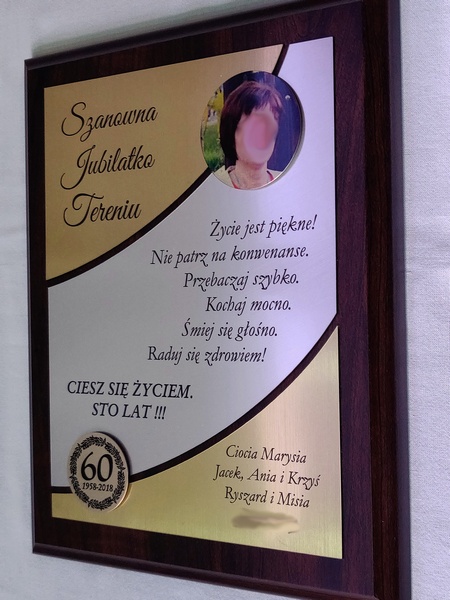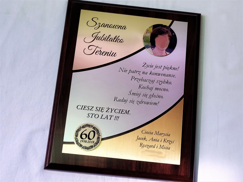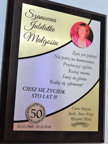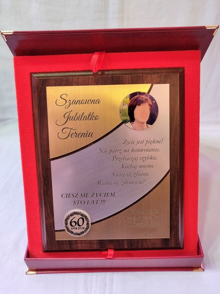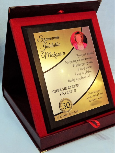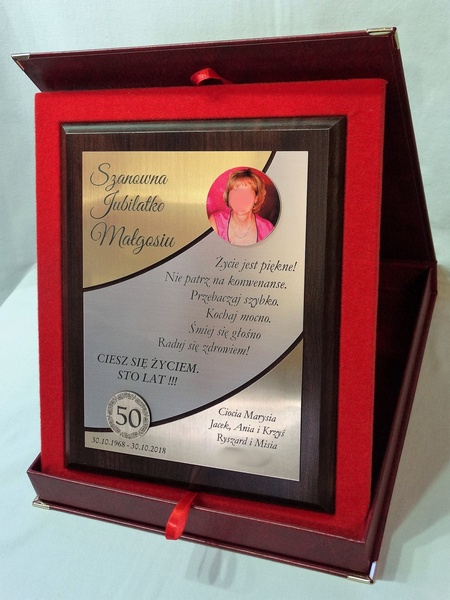 - z dopasowanych do siebie złotego i srebrnego laminatów z grawerowaną dedykacją oraz