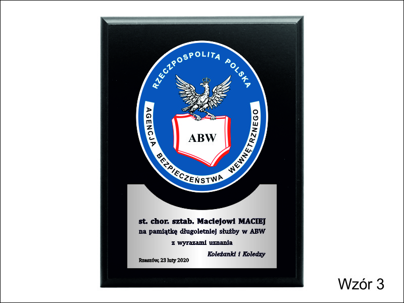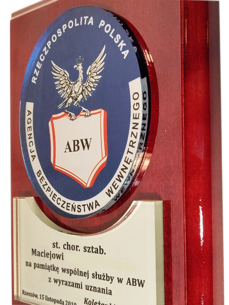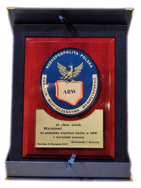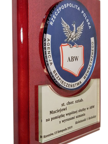 - z umieszczonej pod odznaką bezbarwnej pleksi z nadrukiem pamiątkowej dedykacji,