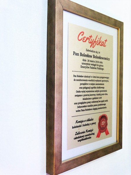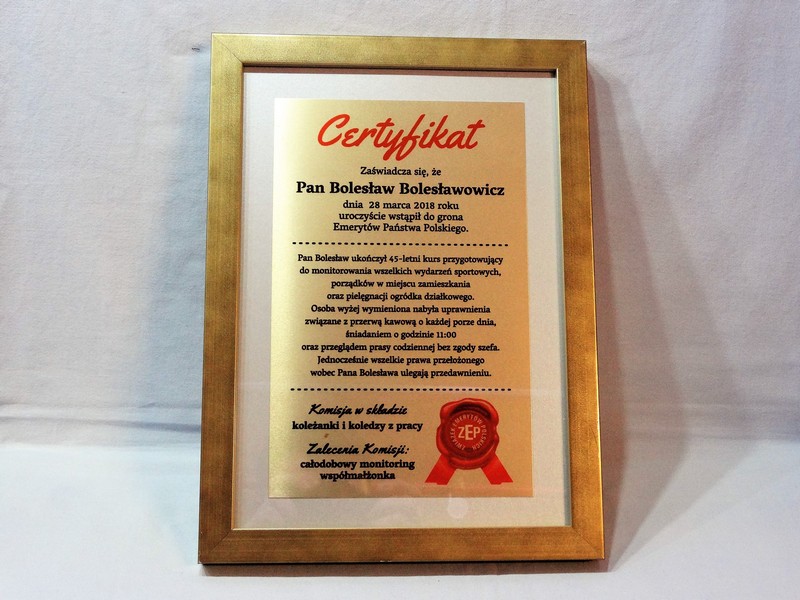 Prezentowany dyplom dedykowany jest jako certyfikat emeryta, ale można wykonać go też na inną okoliczność.