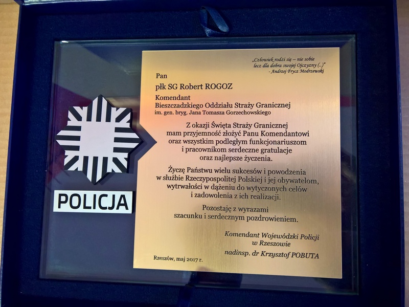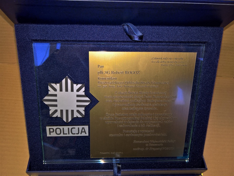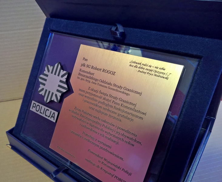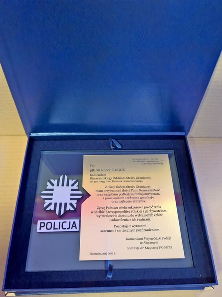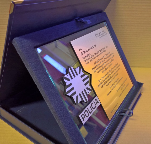 Złożony okolicznościowy dyplom szklany w dedykowanym, eleganckim wyściełanym etui.