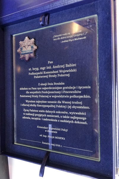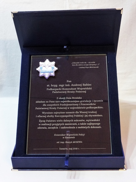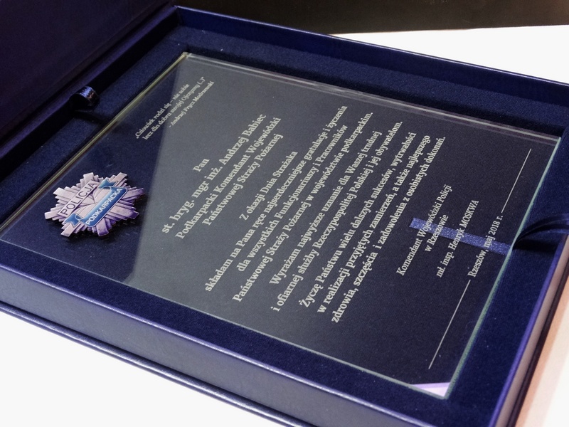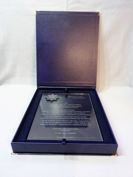 Szklany dyplom okolicznościowy w dedykowanym wyściełanym etui.