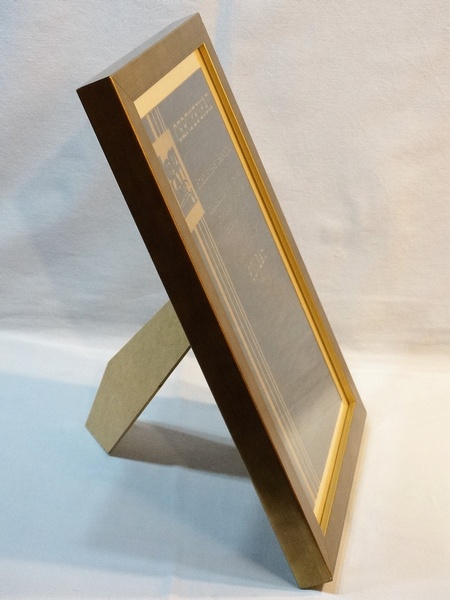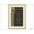 Dedykacja, grafiki, zdjęcia oraz logotypy nadrukowane są.na złotej blaszce lub grawerowane w laminacie i umieszczone są za szkłem w złoconej ramce.