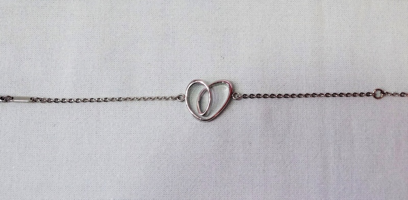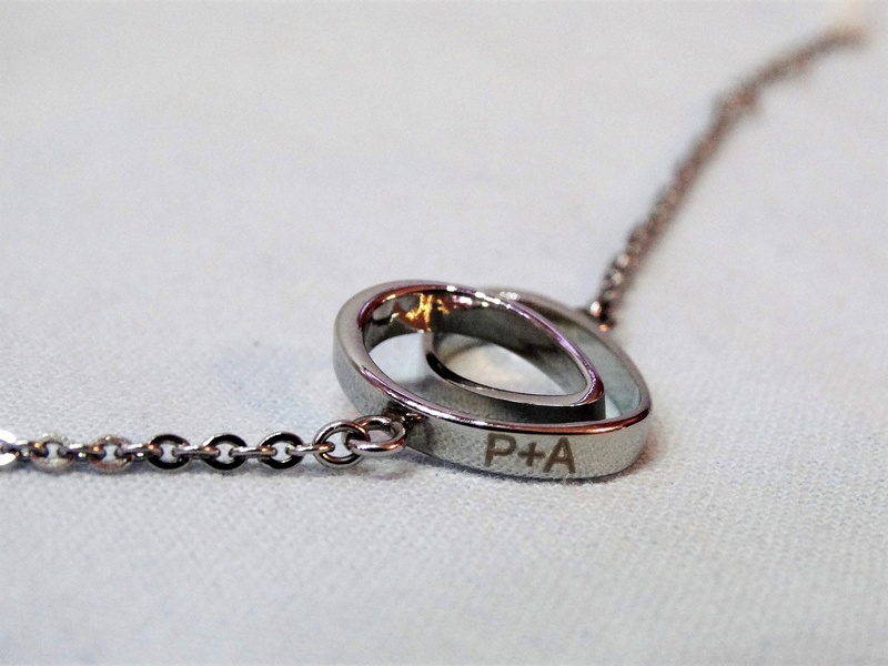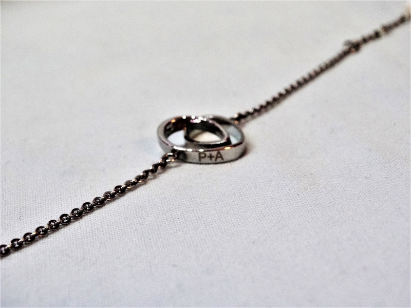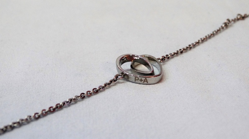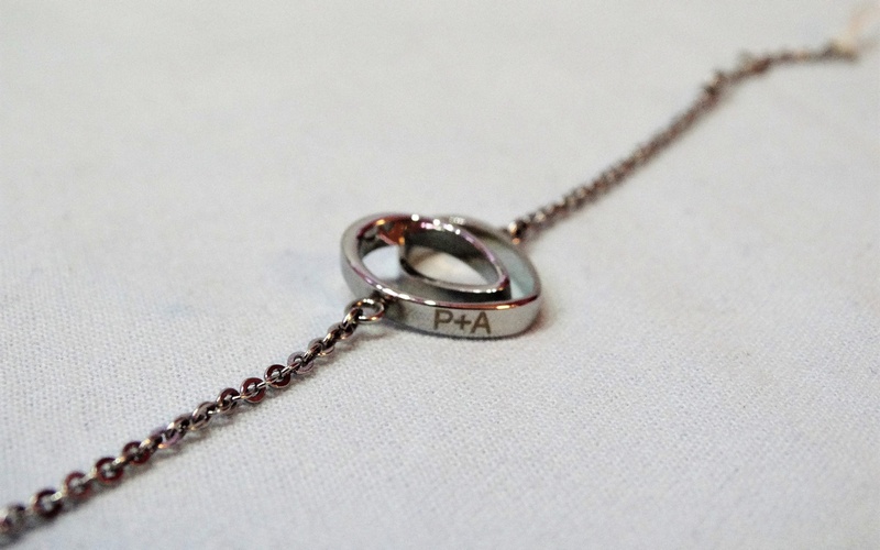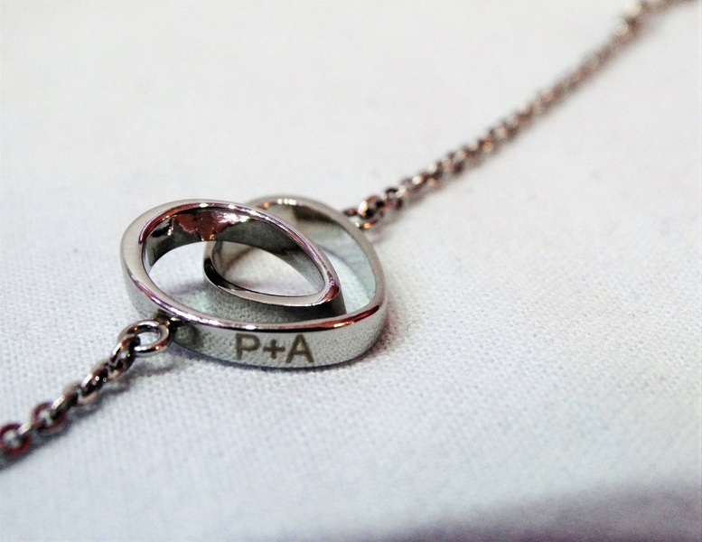Usługa grawerowania bransoletki w formie srebrnej ozdoby w kształcie serca umocowanego na łańcuszku.