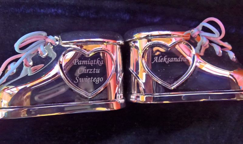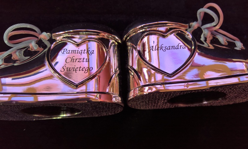 Usługa grawerowania pamiątkowych złotych bucików biżuteryjnych.