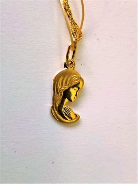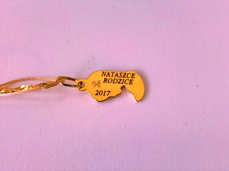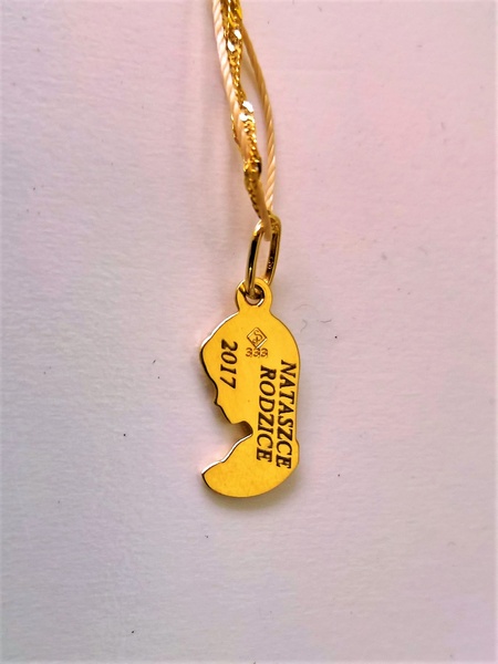 Usługa grawerowania na drobnym, małym złotym medaliku w kształcie Maryi.