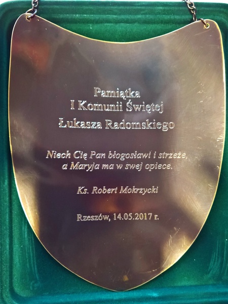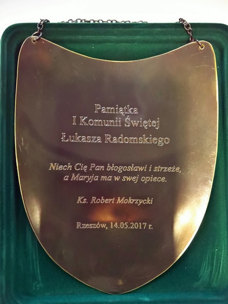 Usługa grawerowania pamiątkowego ryngrafu w kształcie dużej tarczy.