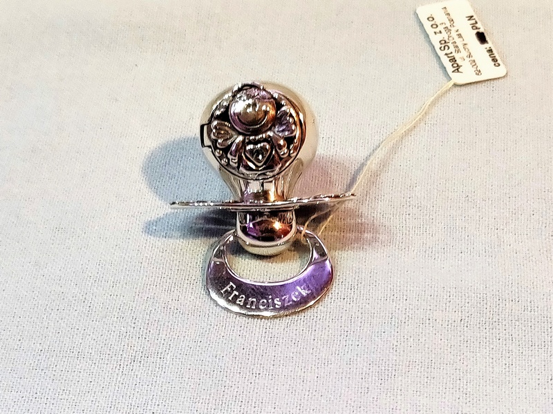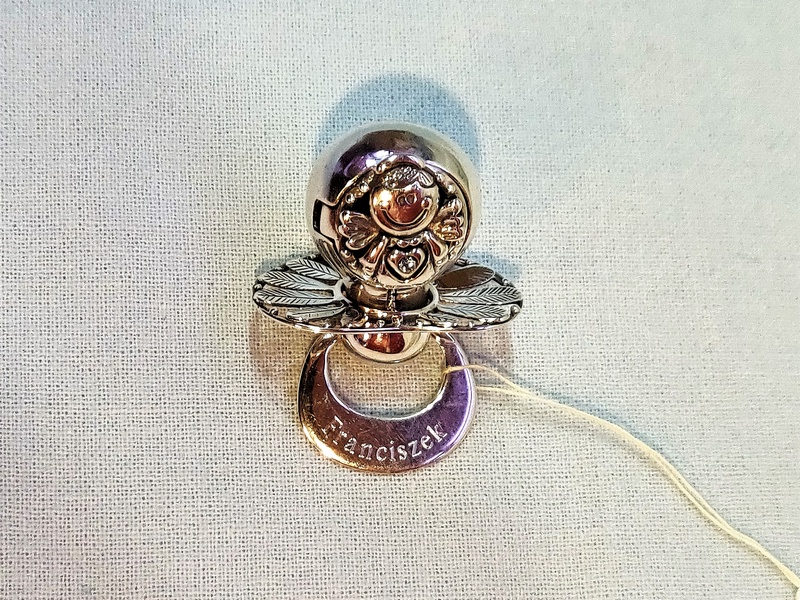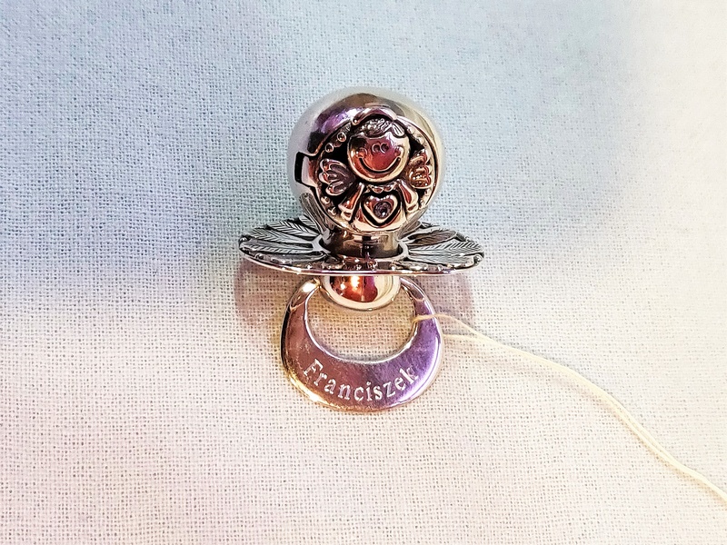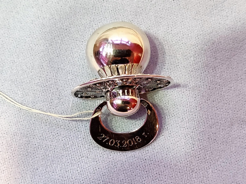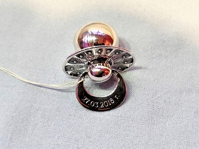 Usługa grawerowania srebrnego pamiątkowego smoczka.