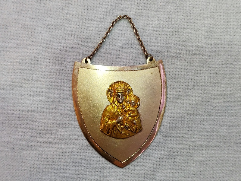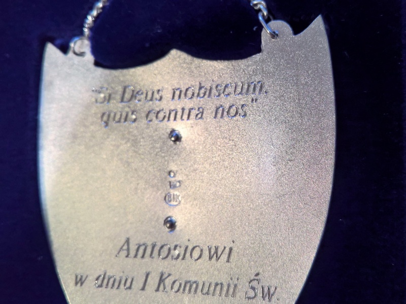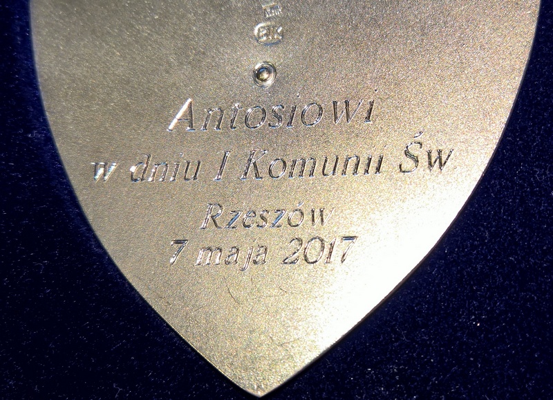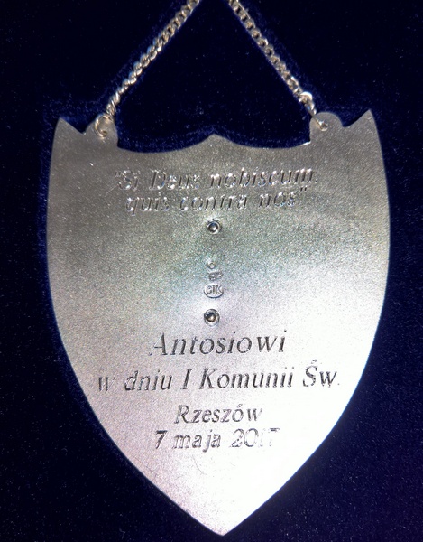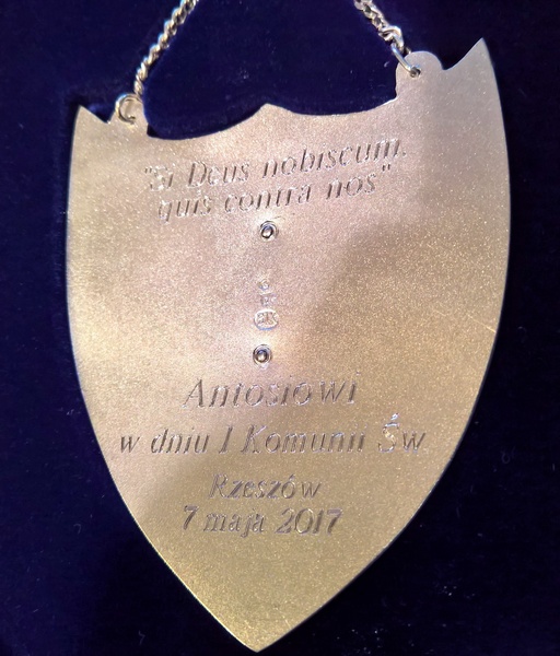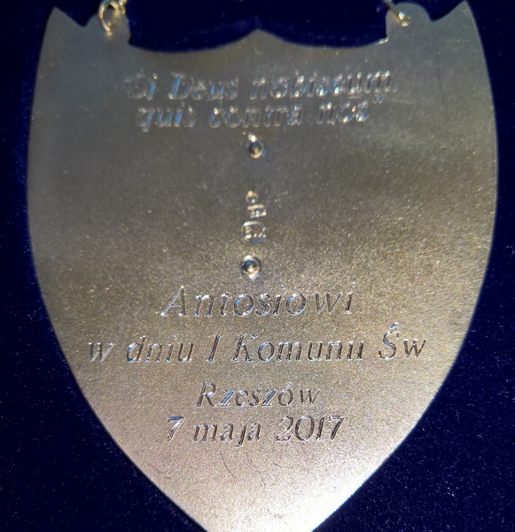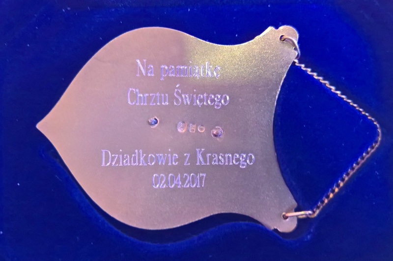 Usługa grawerowania srebrnego ryngrafu w kształcie dużej tarczy.
