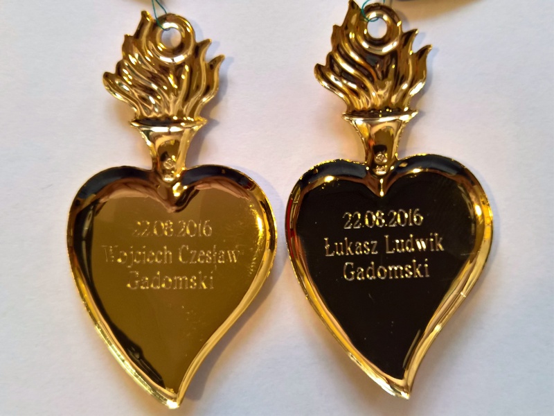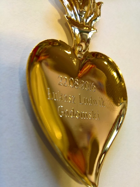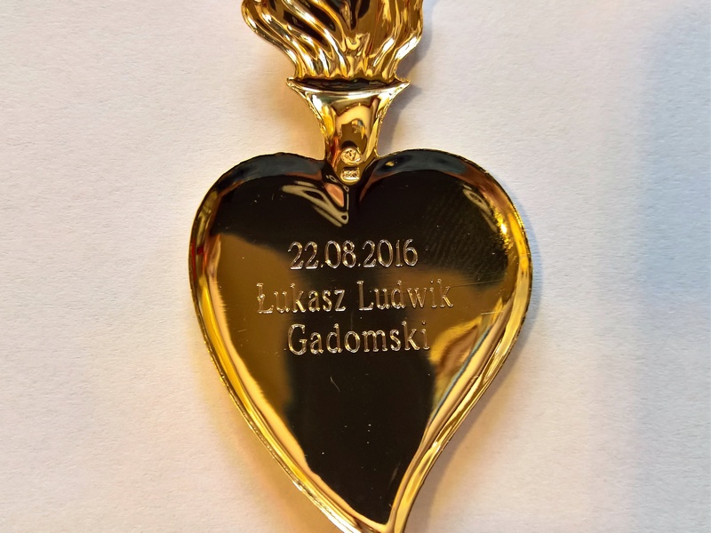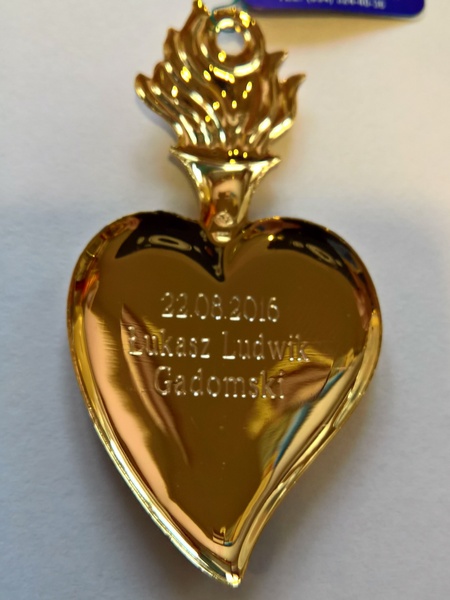 Usługa grawerowania złotego ryngrafu w kształcie serca.