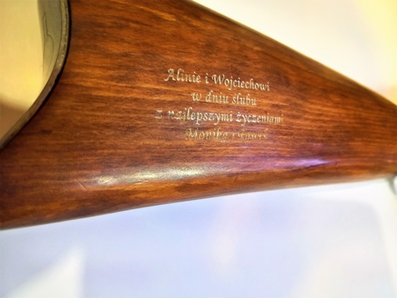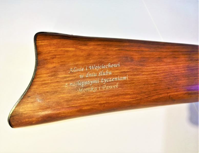 Grawer wykonany jest przez laserowe wypalenie na kolbie pamiątkowej strzelby.