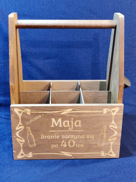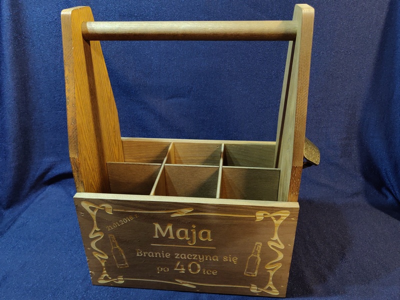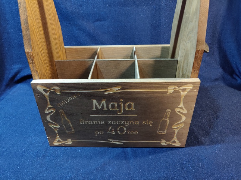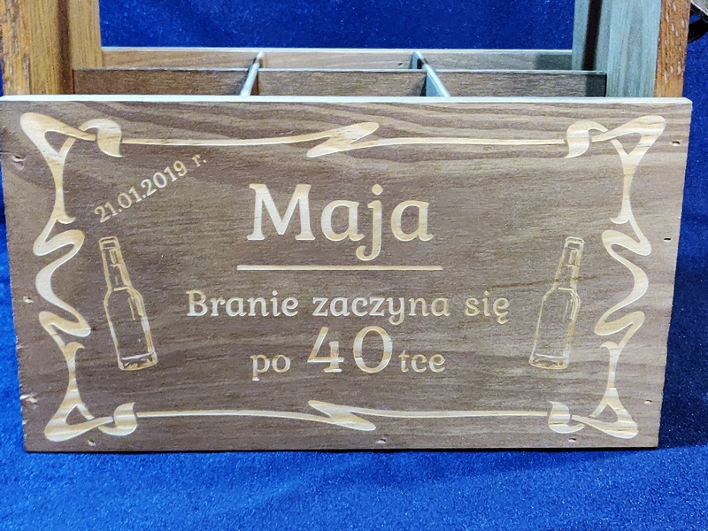 Usługa grawerowania na drewnianej bejcowanej skrzynce na napoje.