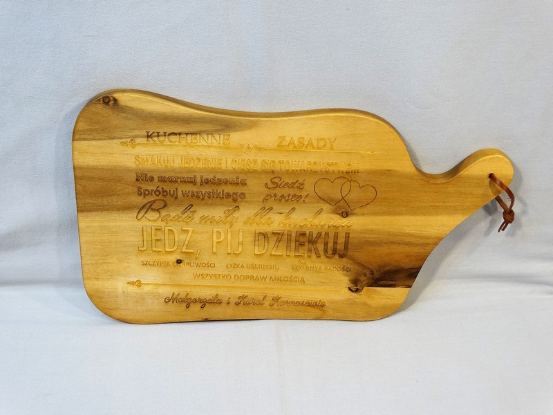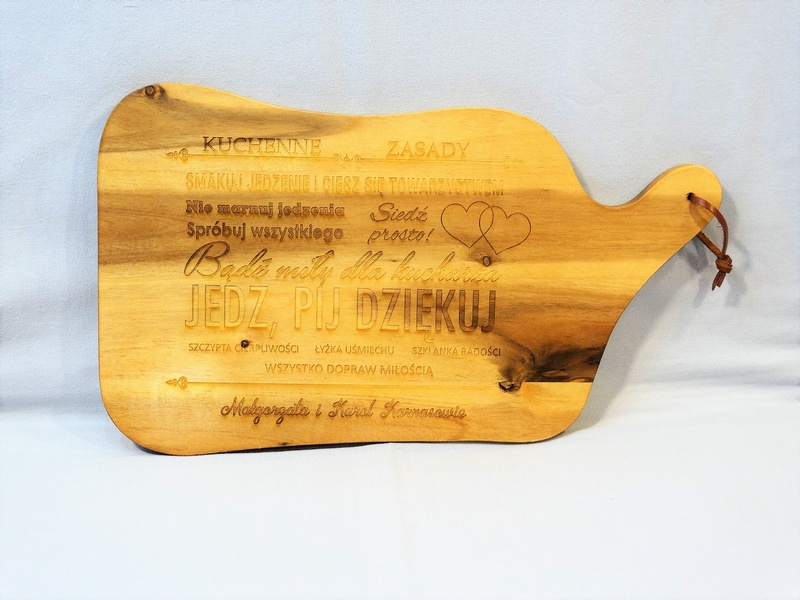Usługa grawerowania drewnianej tekowej deski kuchennej.