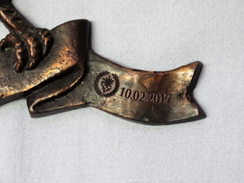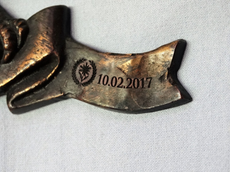 W prezentowanym przykładzie grawerowana jest herb - szarotka oraz pamiątkowa dedykacja.