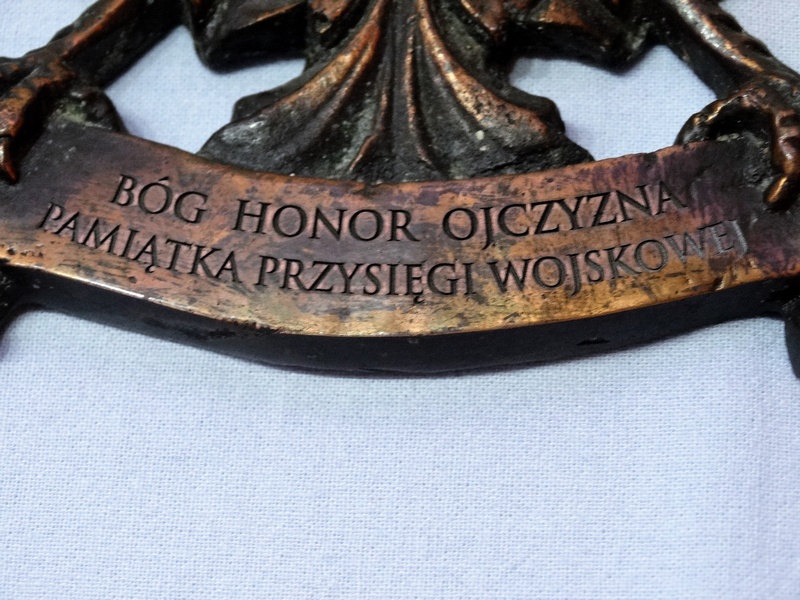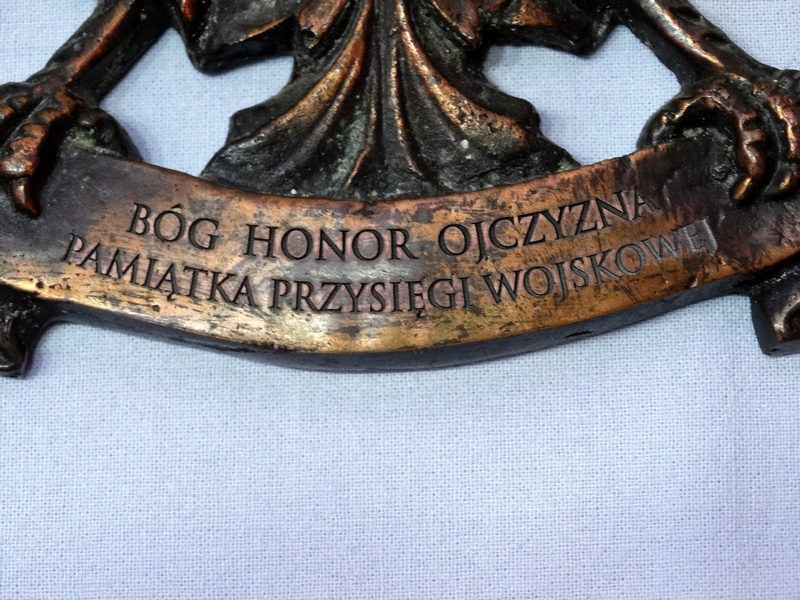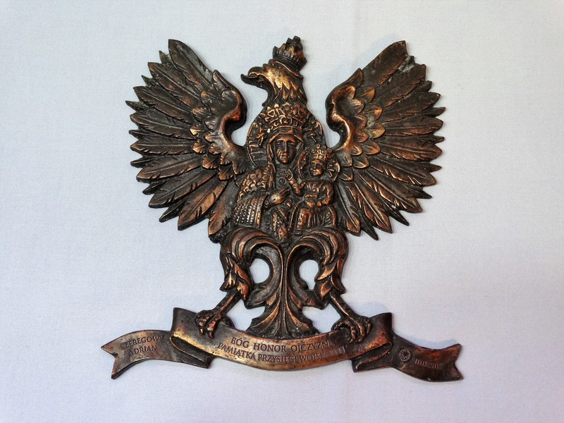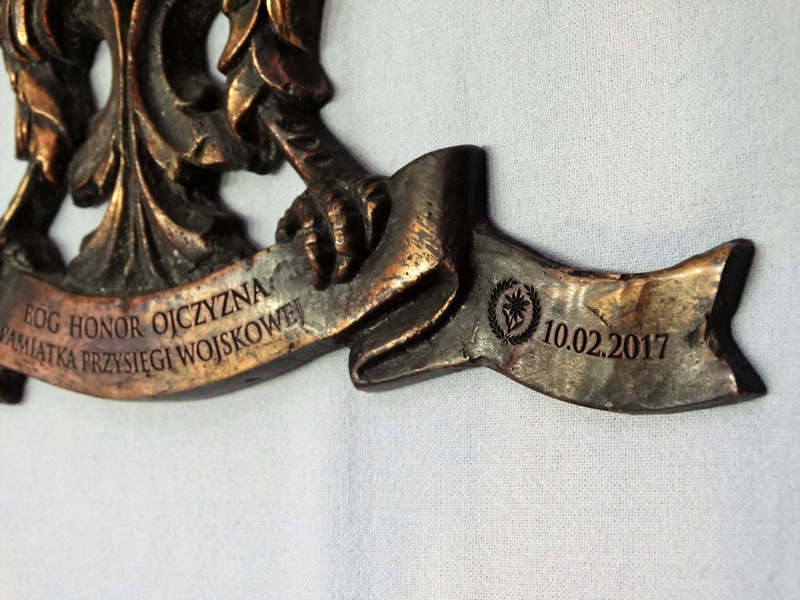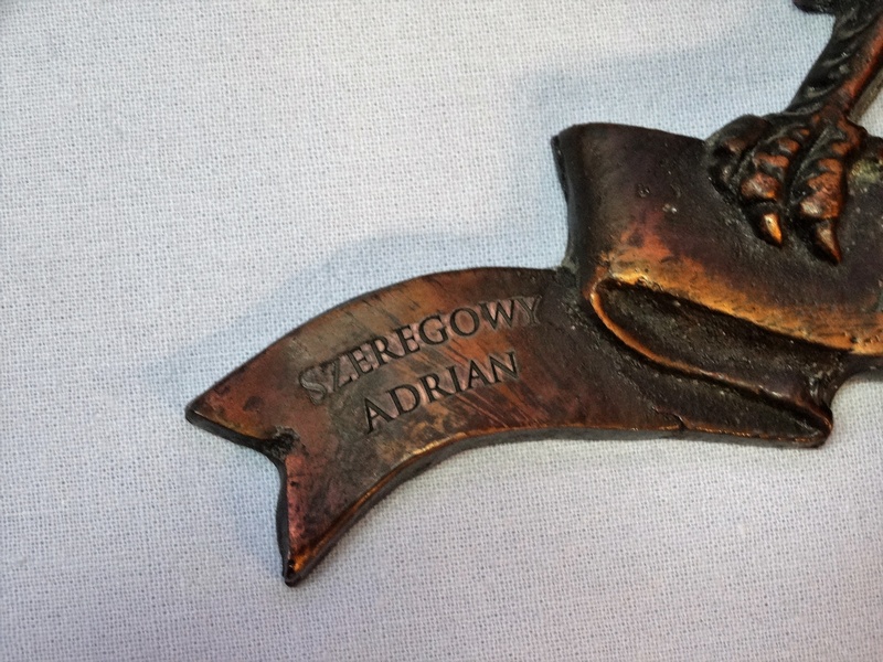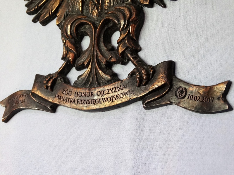 Usługa grawerowania na mosiężnym emblemacie w kształcie orła ze wstęgą.