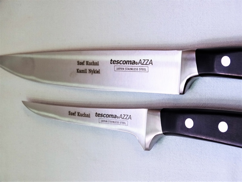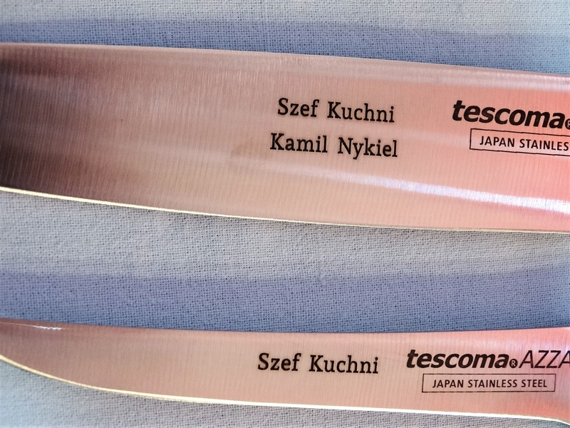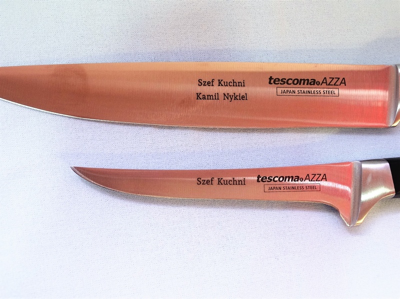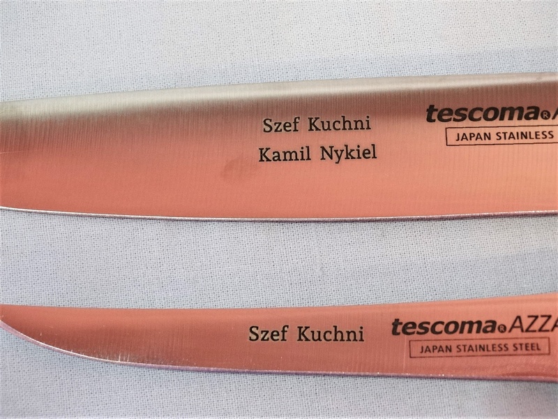 Usługa grawerowania na klindze stalowych noży kuchennych.
