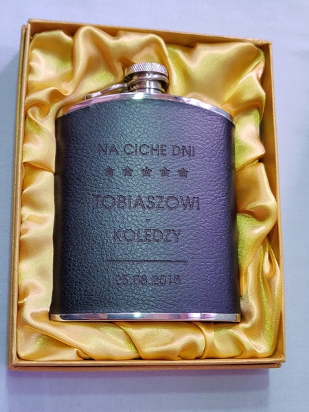 Grawer wykonany jest laserowo na skórzanej obwolucie piersiówki.