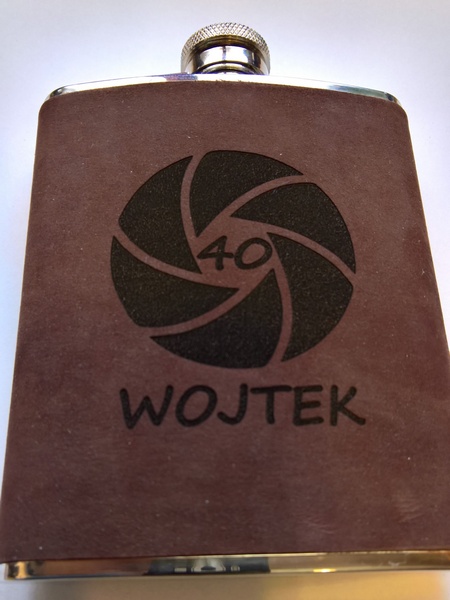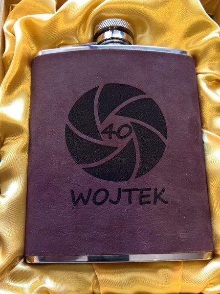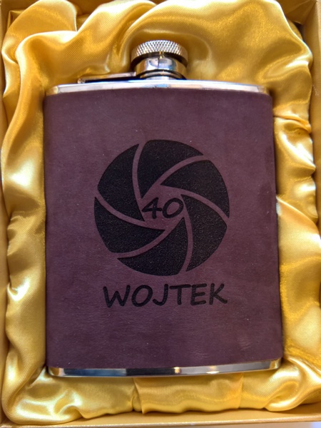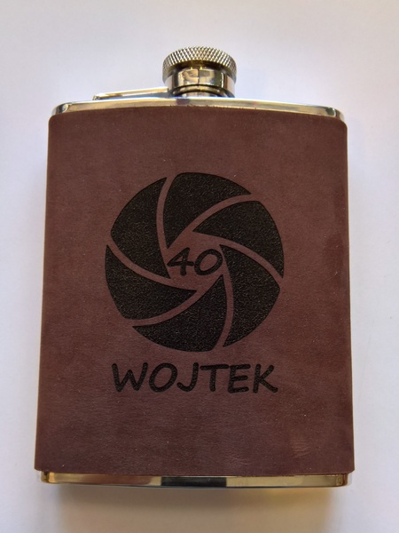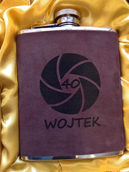 Usługa grawerowania na skórzanej zamszowej piersiówce.