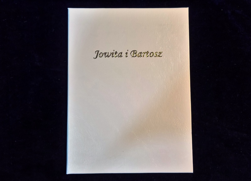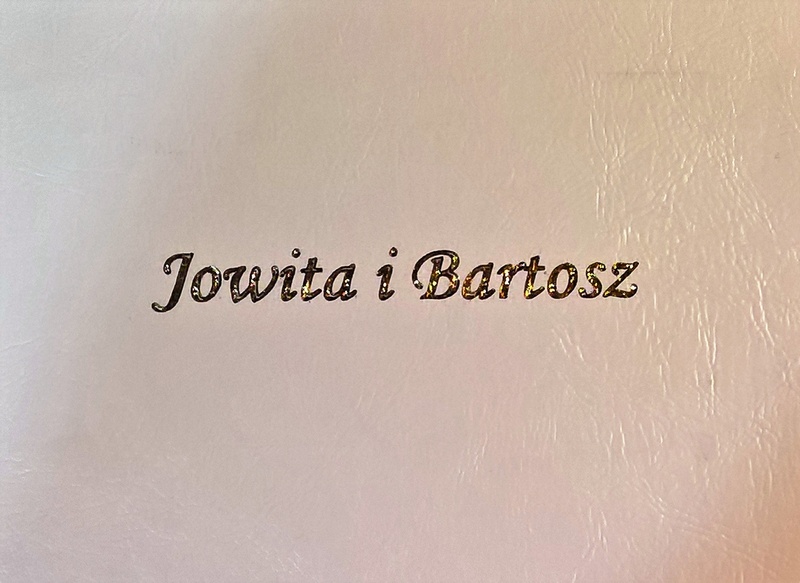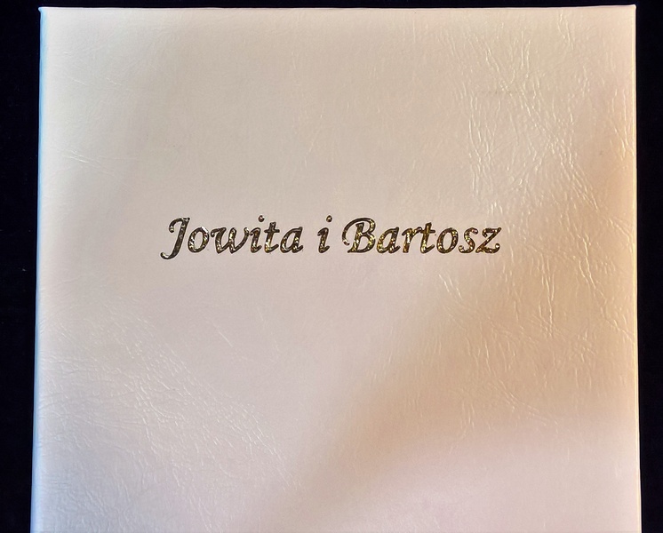 Grawer złoconego napisu wykonany jest na skórzanej lub skóropodobnej okładce pamiątkowego albumu na zdjęcia.