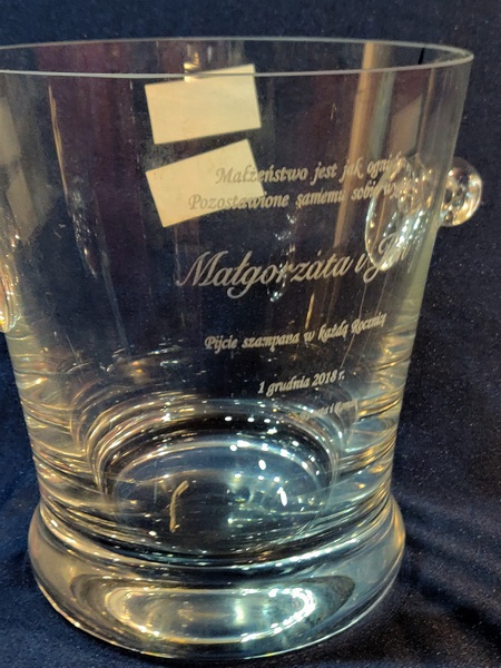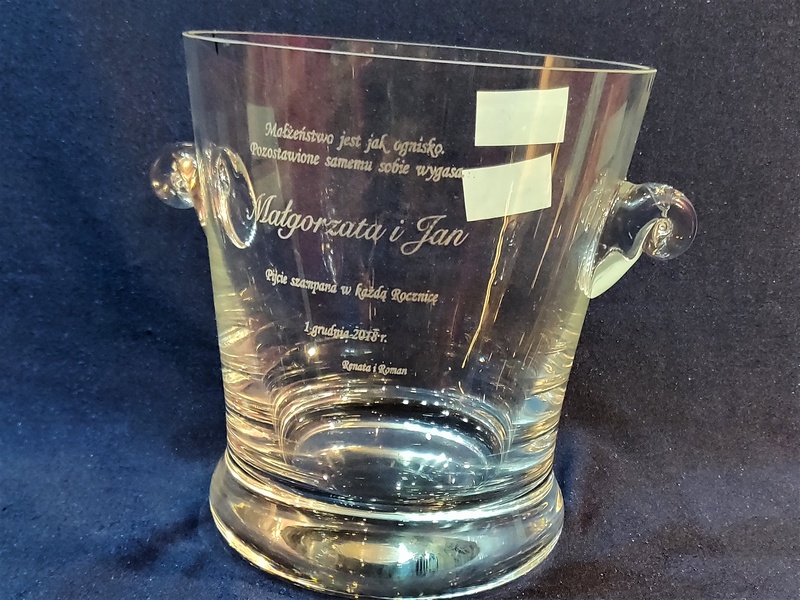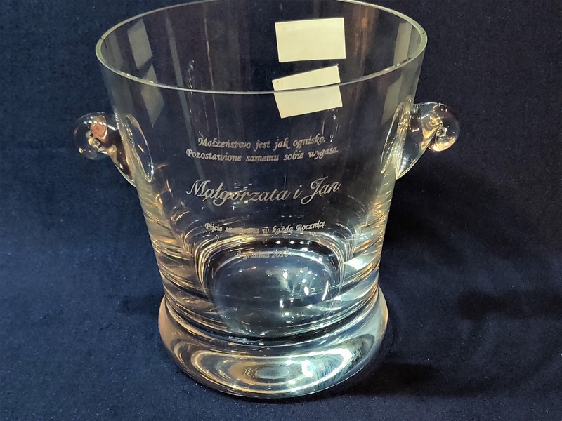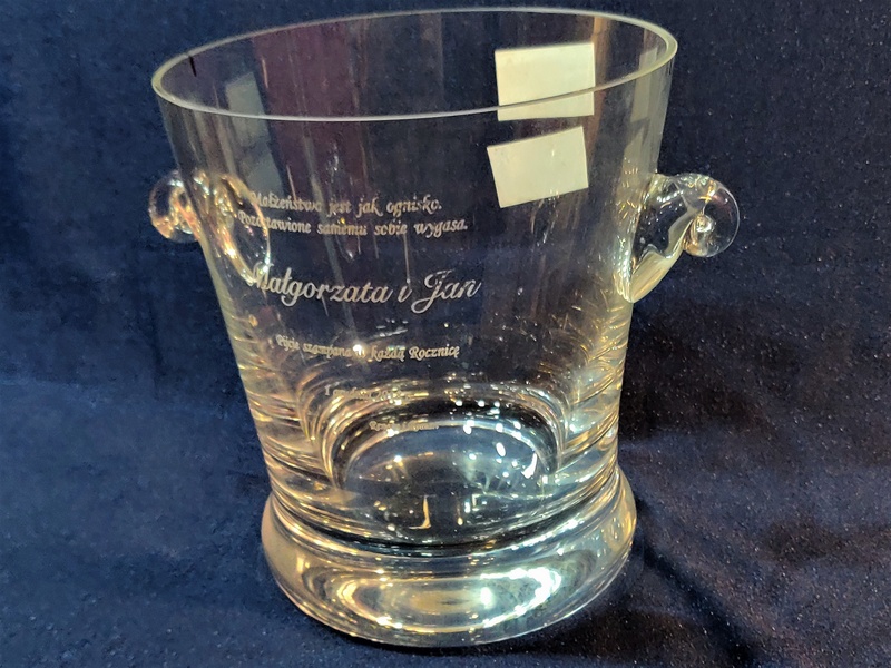 Usługa grawerowania na szklanym okrągłym dzbanku na lód.