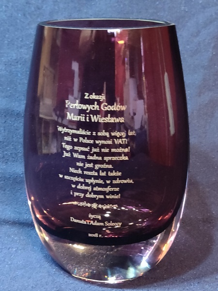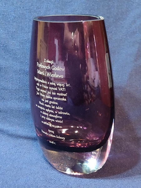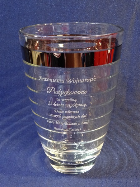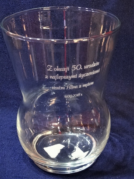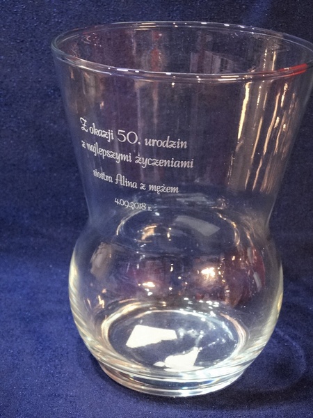 Usługa grawerowania na szklanym okrągłym wazonie.